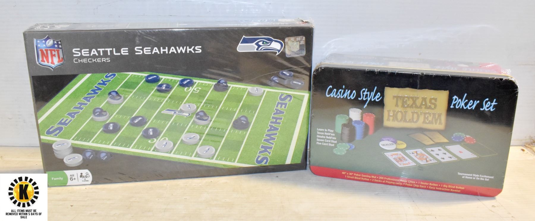 HOLD' EM POKER SET & MASTERPIECES NFL SEAHAWKS CHECKER SET