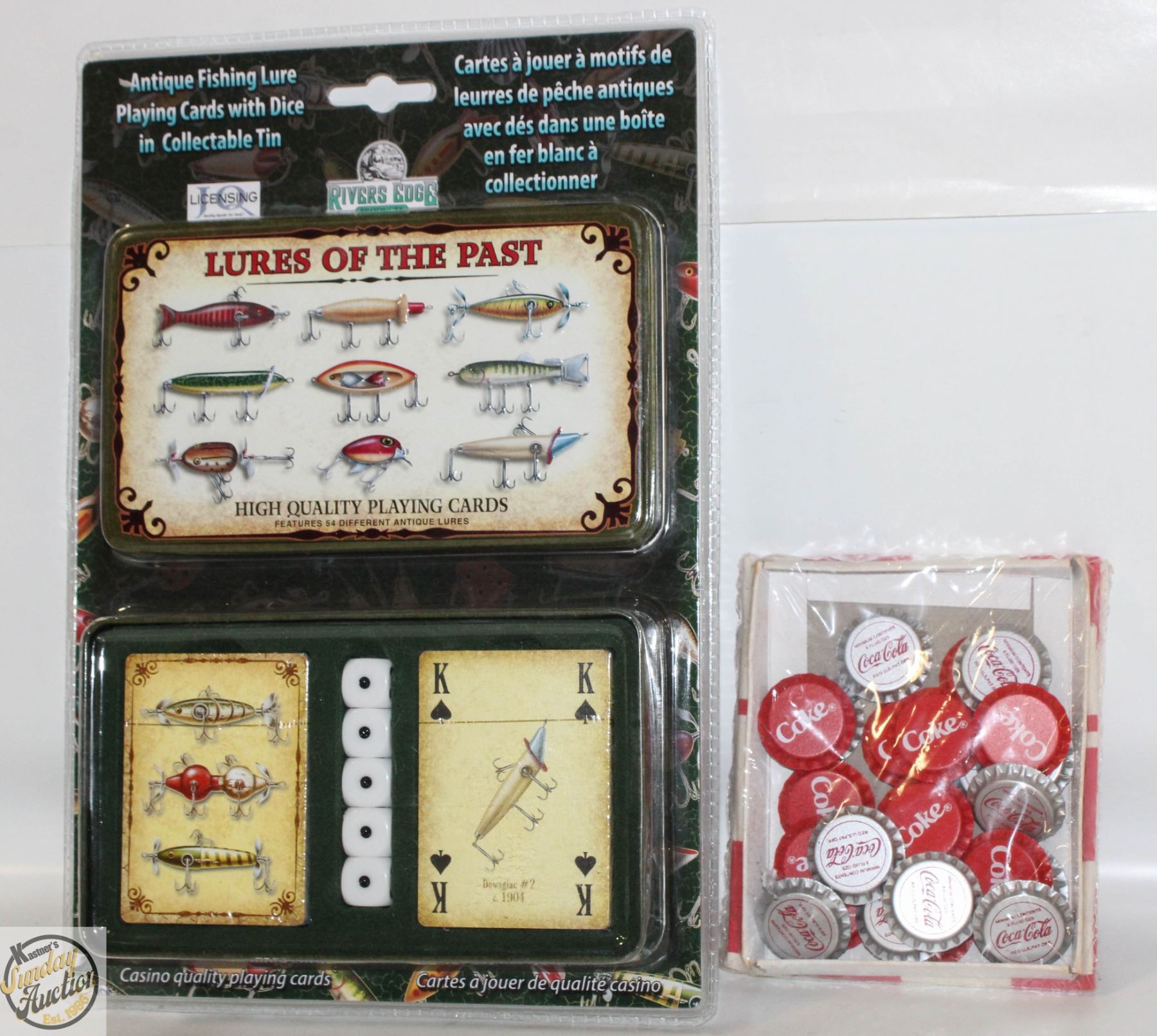 FISHING LURE PLAYING CARDS WITH DICE IN COLLECIBLE TIN & SEALED (VINTAGE) COCA-COLA FABRIC CHECKERBOARD WITH RED & SILVER COKE BOTTLE CAPS **ALL ITEMS MUST BE REMOVED BY 5PM SATURDAY, JUNE 14TH 2025. ALL REMAINING ITEMS WILL BE SUBJECT TO A $6.00 PER DAY STORAGE CHARGE. ANY ITEMS REMAINING AFTER MONDAY, JUNE 30TH, 2025 WILL BE CONSIDERED FORFEITED. NO REFUNDS WILL BE ISSUED FOR FORFEITED ITEMS. TO SCHEDULE A PICK UP APPOINTMENT CLICK HERE