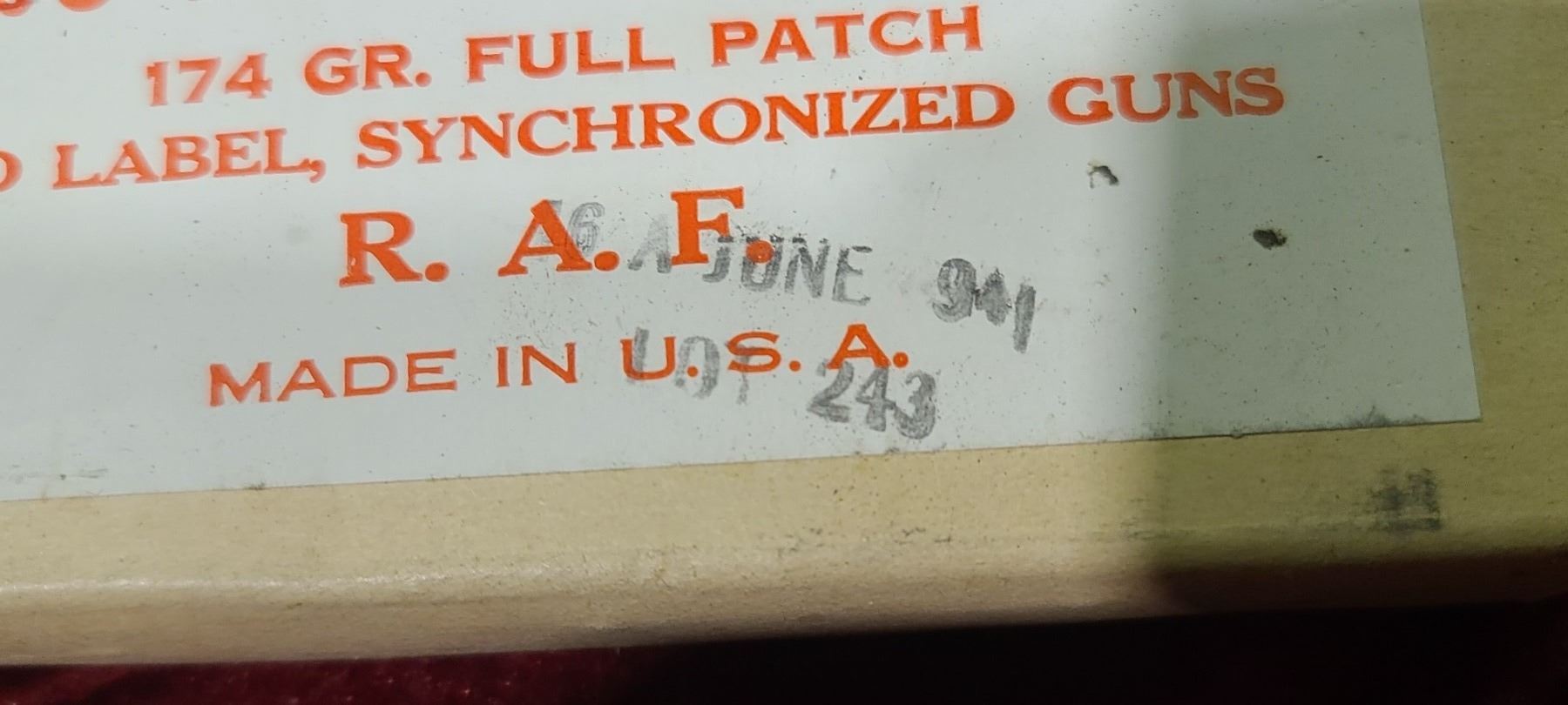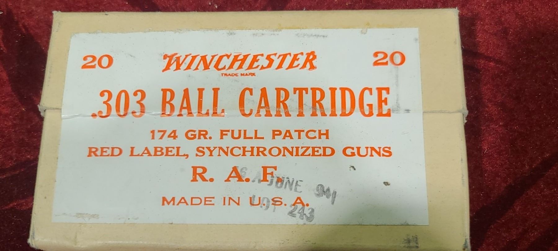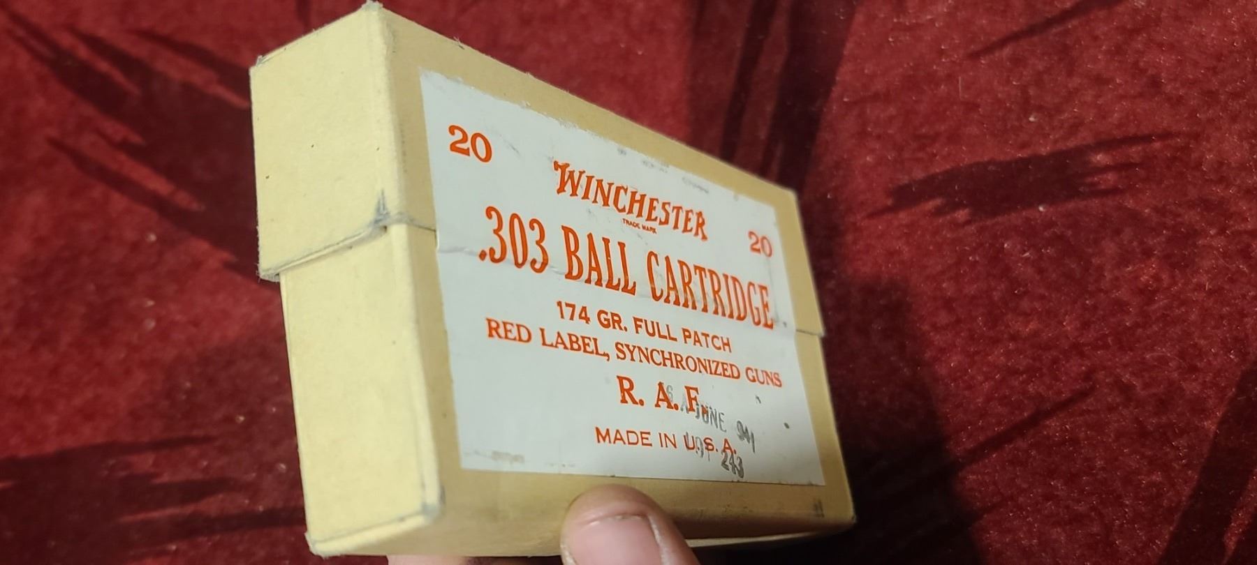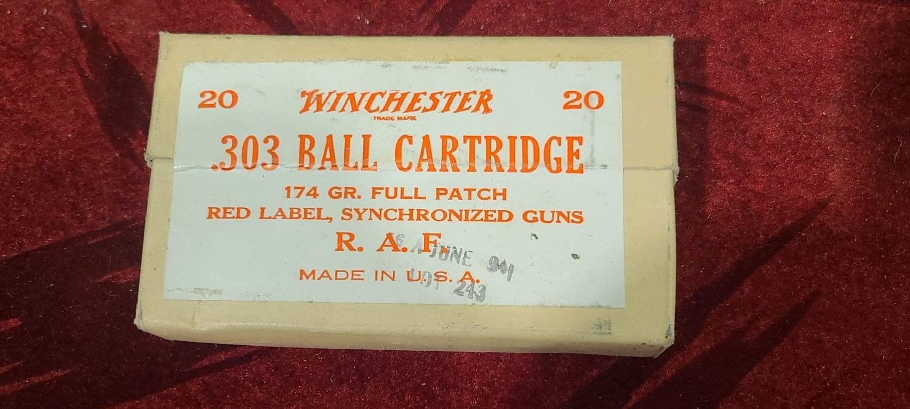 SEALED 20 WINCHESTER .303 BALL CARTRIDGES 174GR FULL PATCH RED LABEL SYNCHRONIZED GUNS R.A.F. MADE IN THEE USA - DATED 16 JUNE