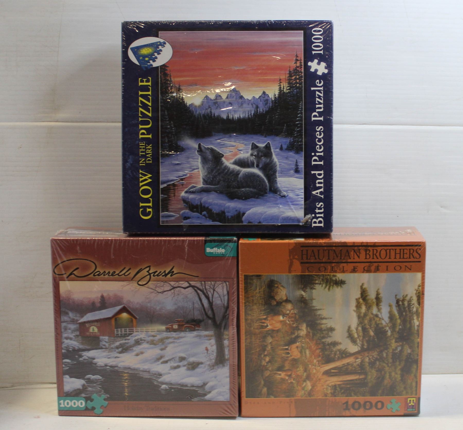 GLOW IN THE DARK W/2 BUFFALO PUZZLES HOLIDAY TRADITIONS & DEAR AND PINES