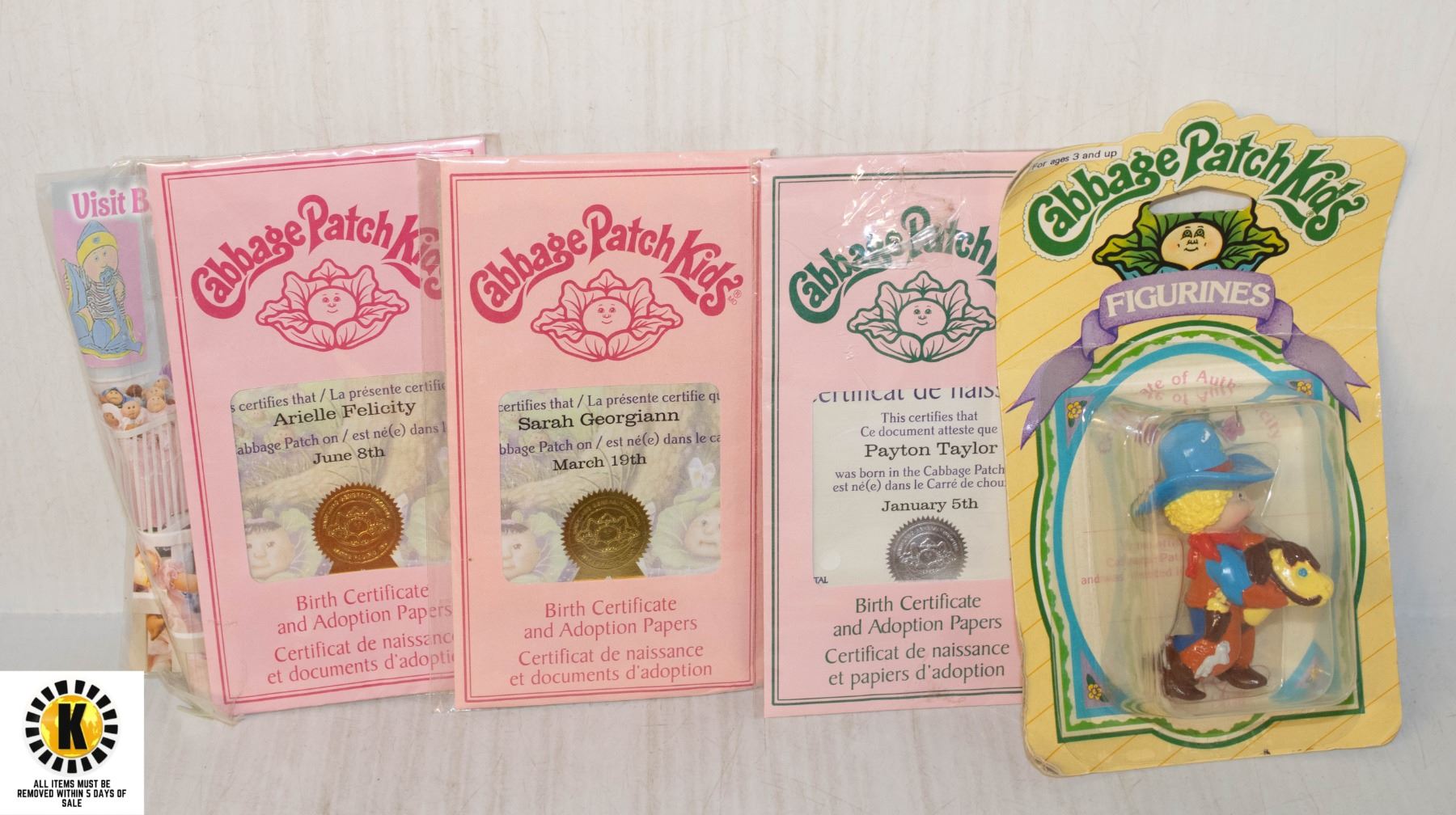 BIRTH CERTIFICATES AND ADOPTION PAPERS PAYTON TAYLOR, SARAH GEORGIANN, ARIELLE FELICITY W/SEALED 1985 FIGURINE CHIEF OF STAFF