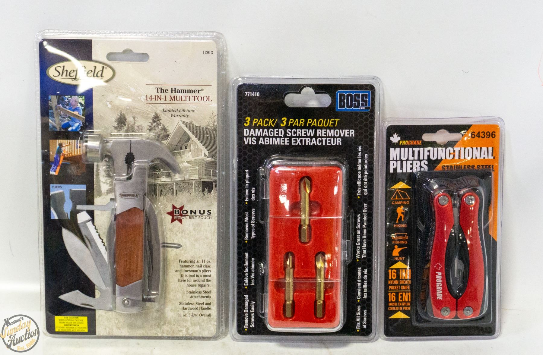 HAMMER 14-1 MULTI-TOOL & BOSS 3-PACK DAMAGED SCREW REMOVER & PROGRADE MULTIFUNCTIONAL PLIERS **ALL ITEMS MUST BE REMOVED BY 5PM SATURDAY, AUGUST 2ND 2025. ALL REMAINING ITEMS WILL BE SUBJECT TO A $6.00 PER DAY STORAGE CHARGE. ANY ITEMS REMAINING AFTER MONDAY, AUGUST 18TH 2025 WILL BE CONSIDERED FORFEITED. NO REFUNDS WILL BE ISSUED FOR FORFEITED ITEMS. TO SCHEDULE A PICK UP APPOINTMENT CLICK HERE