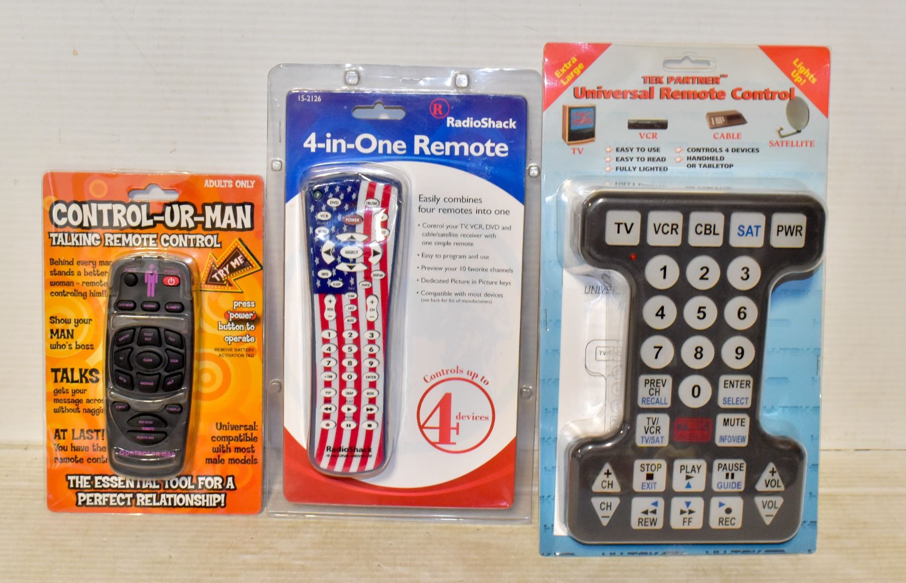 RADIO SHACK 4 IN 1 AMERICAN FLAG, TEK PARTNER UNIVERSAL REMOTE BIG BUTTONS & CONTROL UR-MAN TALKING REMOTE (ADULT)
