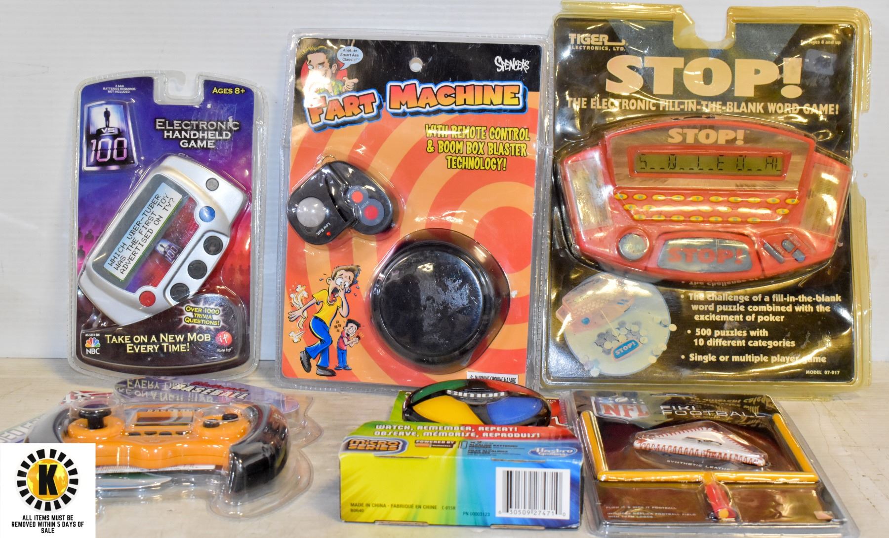 ELECTRICS STOP FILL IN THE BLANK WORD GAME, TAKE ON A NEW MOB EVERYTIME, SIMON SAYS, TOYQUEST BASEBALL W/SPENCERS FART MACHINE & FIKI FOOTBALL