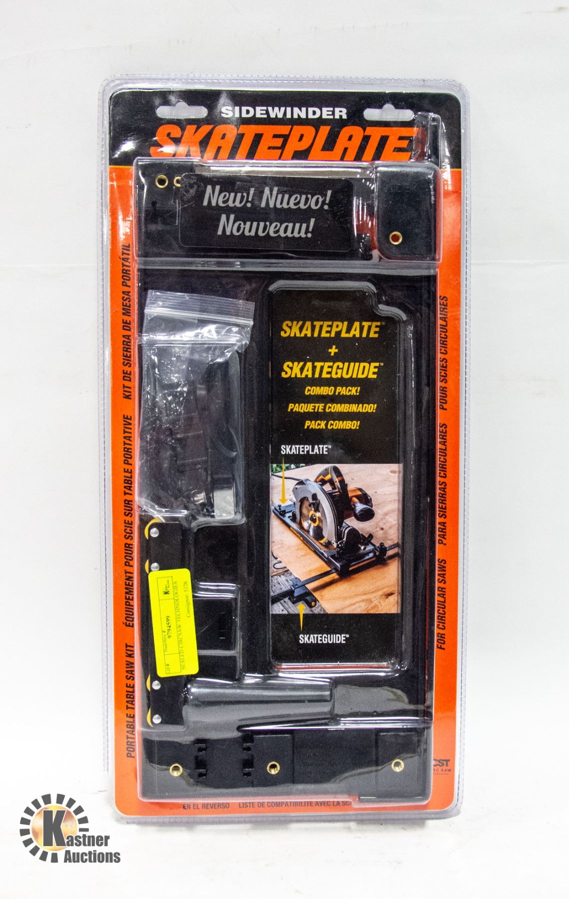 SIDEWINDER SKATEPLATE PORTABLE TABLE SAW KIT **ALL ITEMS MUST BE REMOVED BY 5PM SATURDAY, MAY 20TH 2023. ALL REMAINING ITEMS WILL BE SUBJECT TO A $6.00 PER DAY STORAGE CHARGE. ANY ITEMS REMAINING AFTER MONDAY, JUNE 5TH, 2023 WILL BE CONSIDERED FORFEITED. NO REFUNDS WILL BE ISSUED FOR FORFEITED ITEMS. TO SCHEDULE A PICK UP APPOINTMENT CLICK HERE