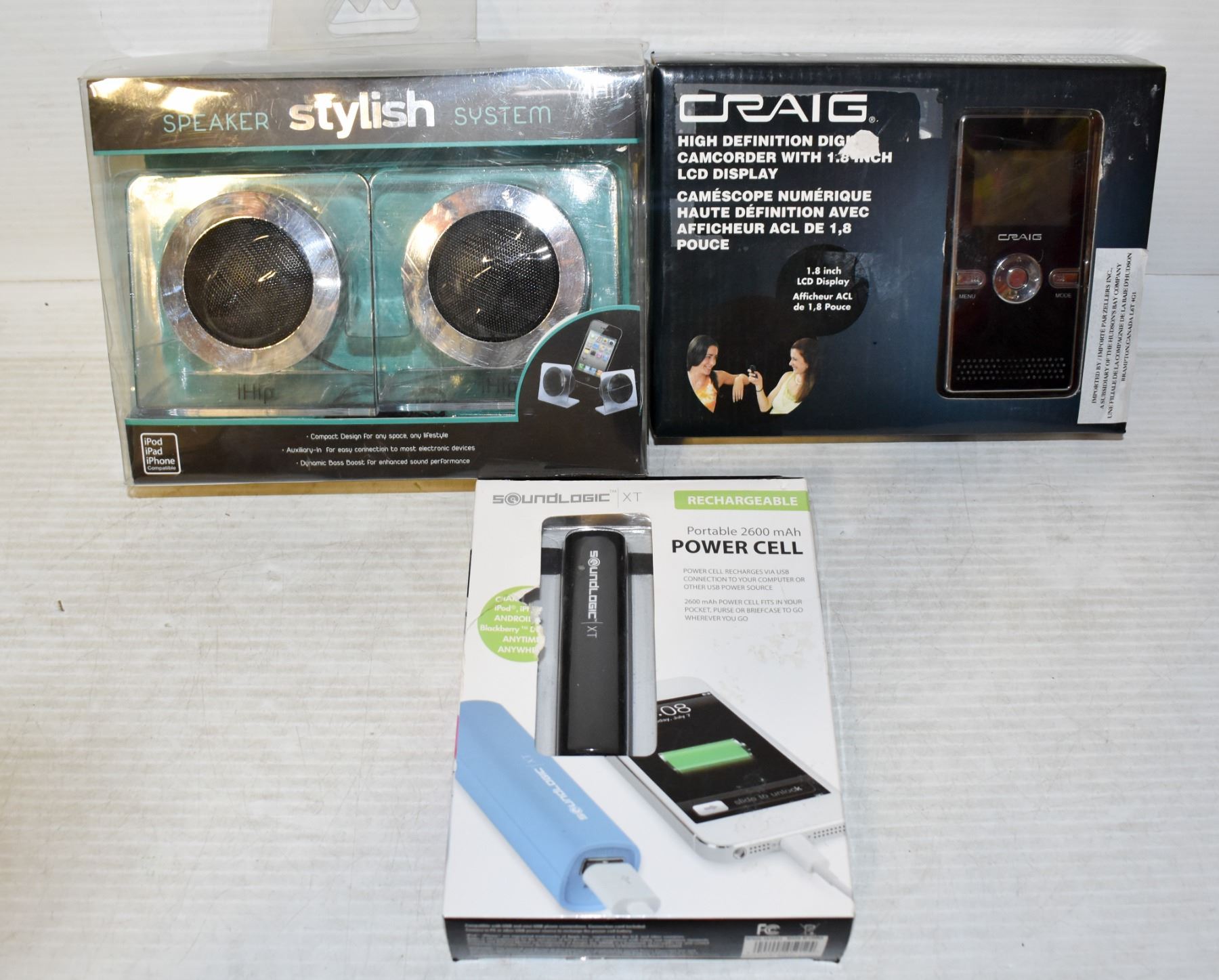 CAMCORDER WITH 1.8 INCH LED DISPLAY W/IHIP 2 SPEAKER SET STYLISH SYSTEM FOR IPOD, IPAD, IPHONE & SOUNDLOGIC XT CHARGEABLE PORTABLE POWER CELL 2600 MAH