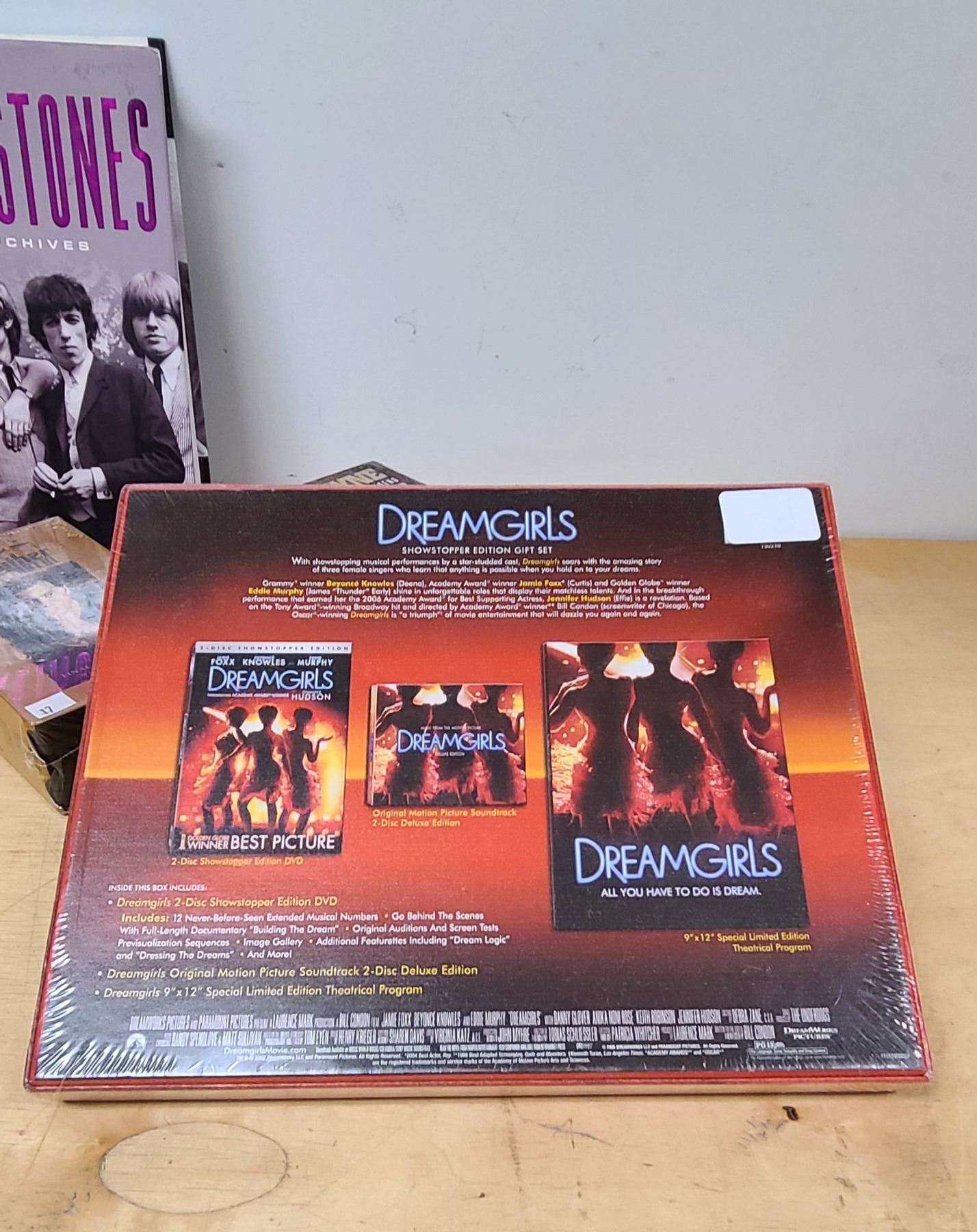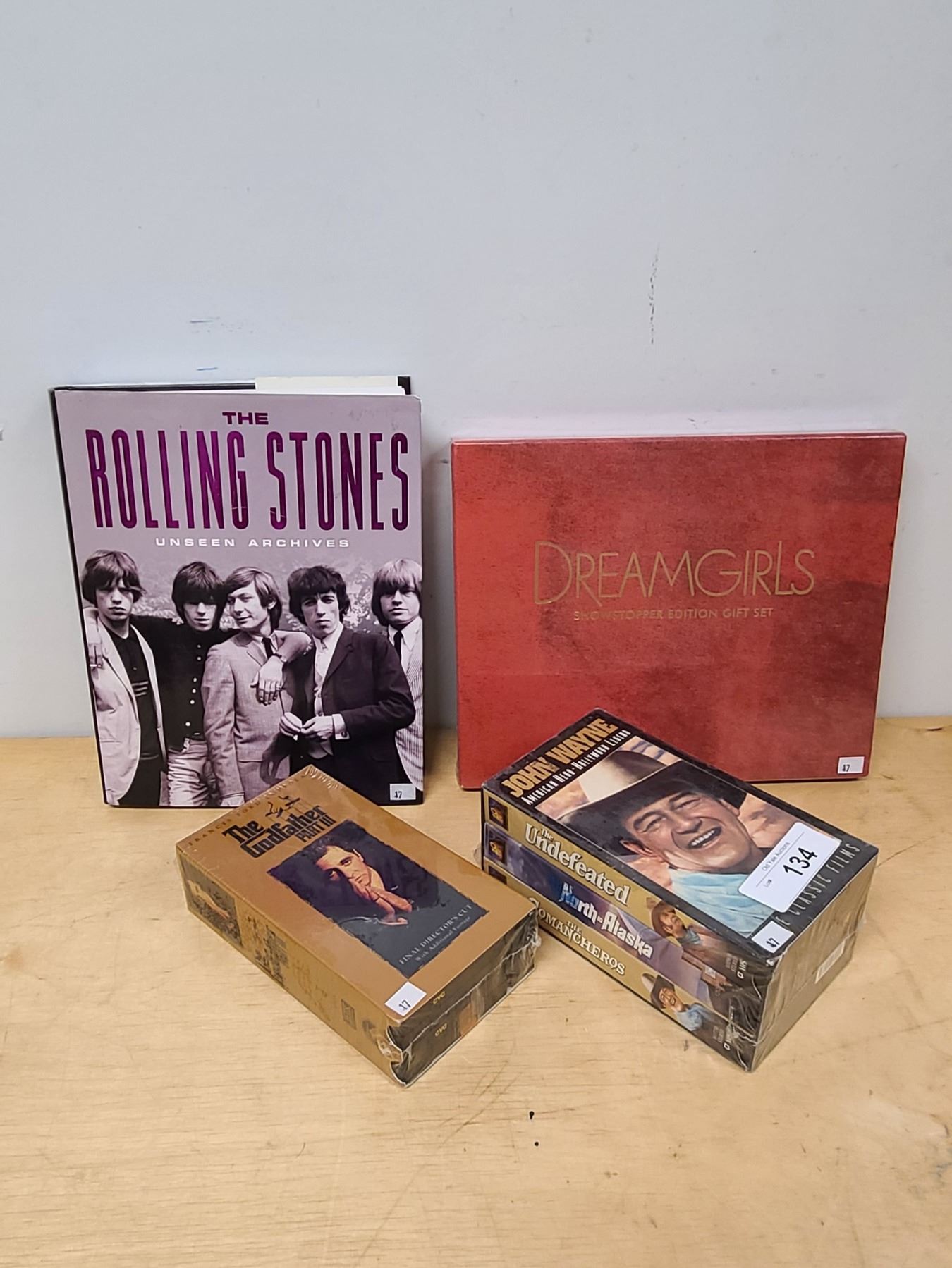 SEALED DREAM GIRLS DVD SET, ROLLING STONES COFFEE TABLE BOOK. JOHN WAYNE & GODFATHER SEALED VHS SETS