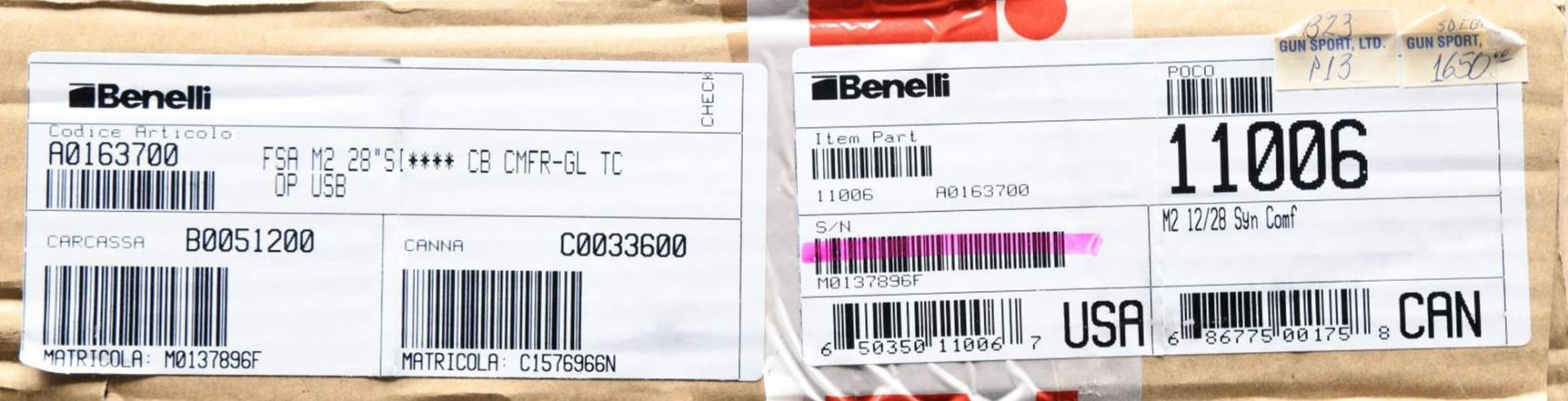 SHOTGUN. Cal. 12 GA, 2 3/4" 7 3". S# M0137896F. Bbl. 28". Sealed in box M2 semi-automatic shotgun mfg. by Benelli in Italy and imported by Benelli USA Corp. Model #11006. Metal components exhibit a matte finish. Black synthetic buttstock and forend. Improved Cylinder choke. CONDITION: as new in box. Exterior of box exhibits some wear from handling and storage, but otherwise remains sturdy and serviceable. PROVENANCE: The Collection of Gun Sport Ltd owned by Jon R. Thomas. (23-3728/MLW). MODERN. $800-1,200.