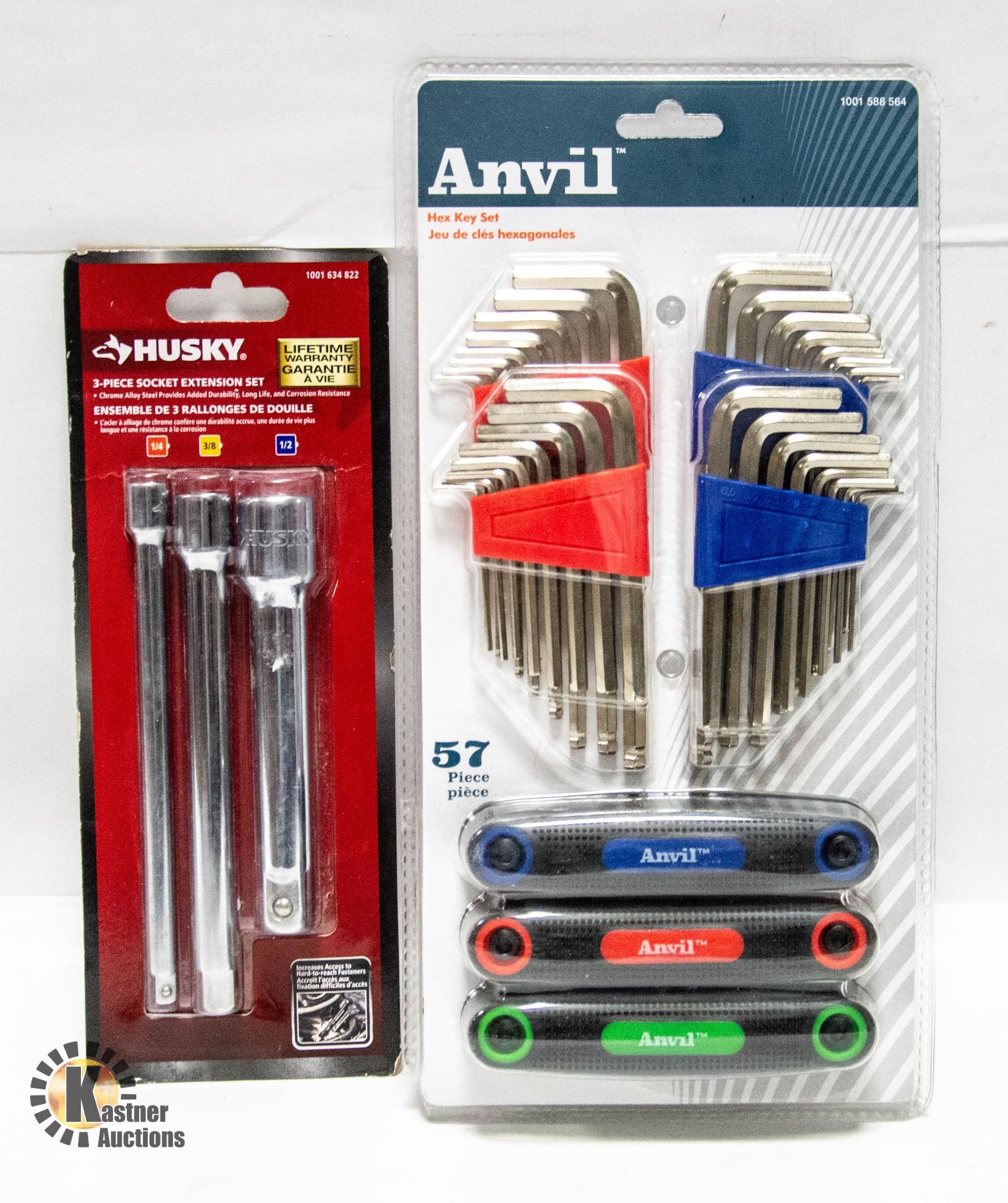 57 PC SET W/HUSKY 3-PC SOCKET EXTENSION SET **ALL ITEMS MUST BE REMOVED BY 5PM SATURDAY, APRIL 15TH 2023. ALL REMAINING ITEMS WILL BE SUBJECT TO A $6.00 PER DAY STORAGE CHARGE. ANY ITEMS REMAINING AFTER MONDAY, APRIL 30TH, 2023 WILL BE CONSIDERED FORFEITED. NO REFUNDS WILL BE ISSUED FOR FORFEITED ITEMS. TO SCHEDULE A PICK UP APPOINTMENT CLICK HERE