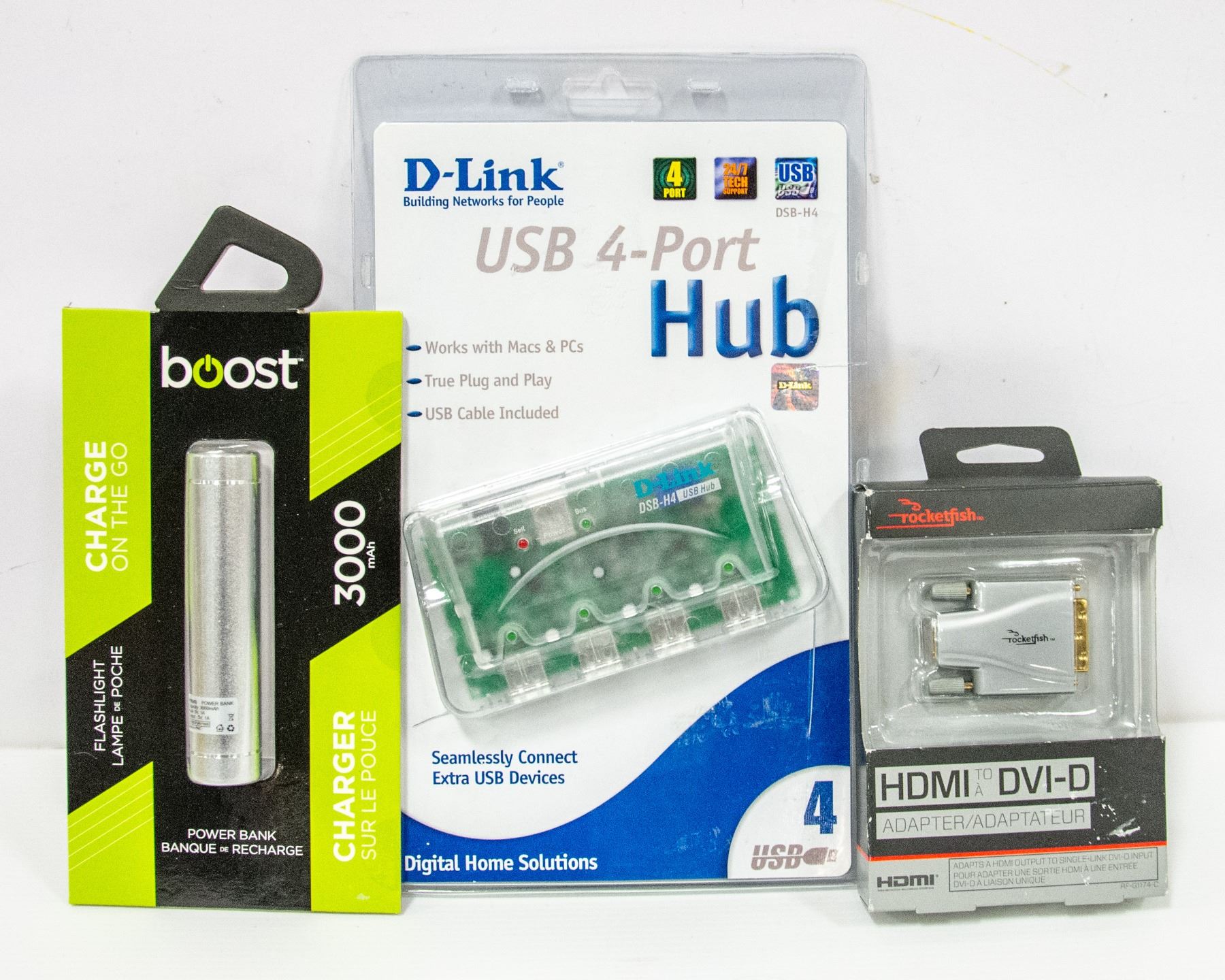 HUB W/BOOST POWER BANK 3000MAH/FLASHLIGHT CHARGER & ROCKETFISH MINI HDJ TO DVI-D ADAPTER