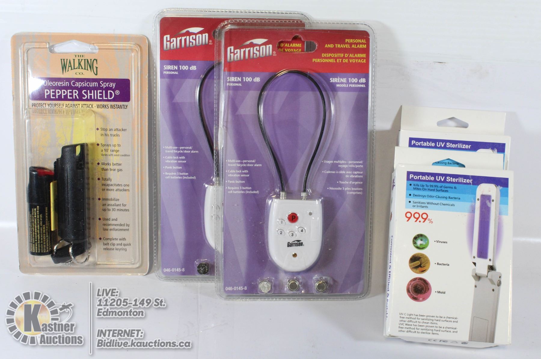 SPRAY, (2) PERSONAL & TRAVEL NECK ALARMS WITH SIREN W/2 PORTABLE HANDHELD SANITIZER WANDS