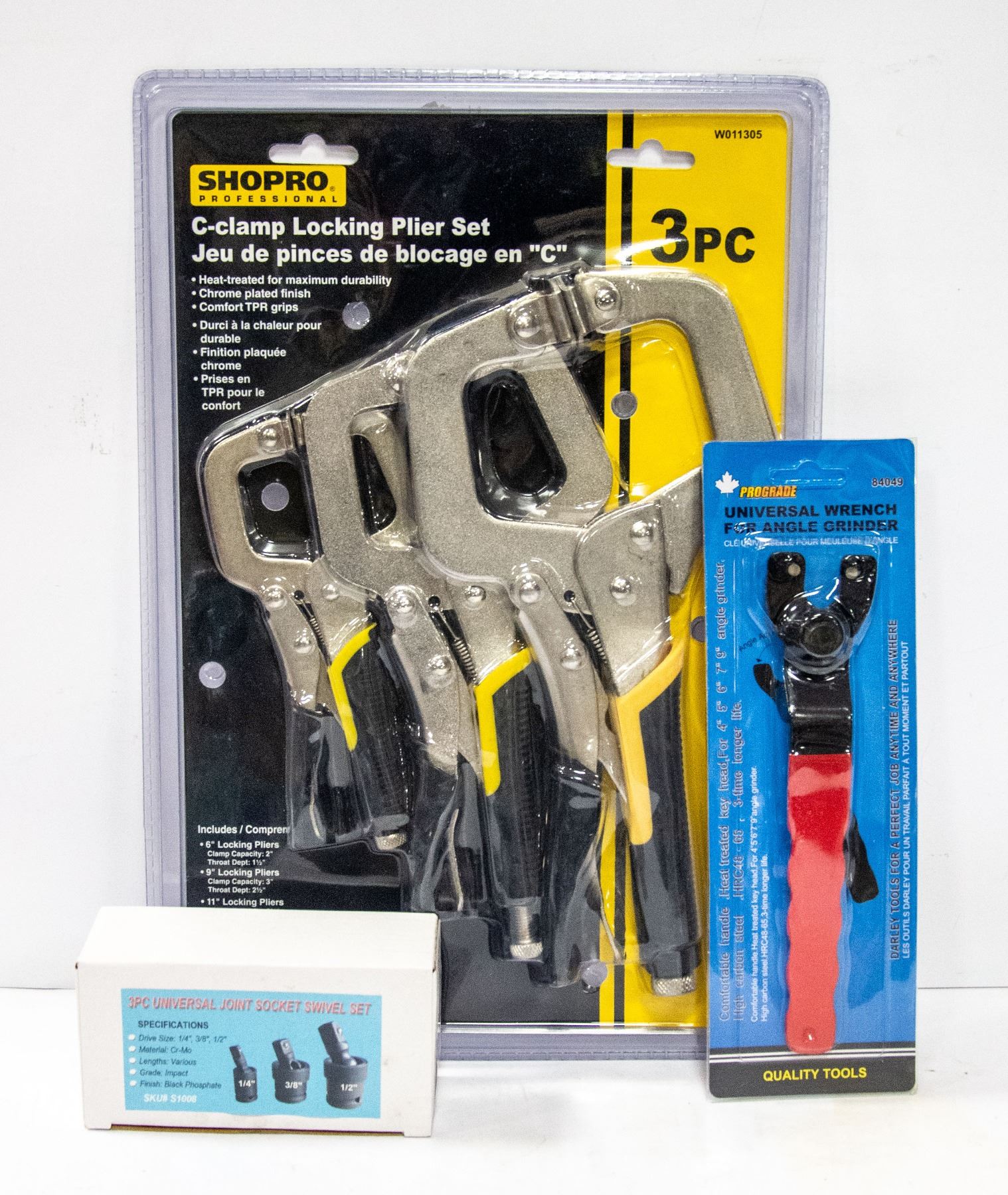 C-CLAMP LOCKING PLIER SET W/UNIVERSAL WRENCH FOR ANGLE GRINDER & 3 PC UNIVERSAL SOCKET SWIVEL SET