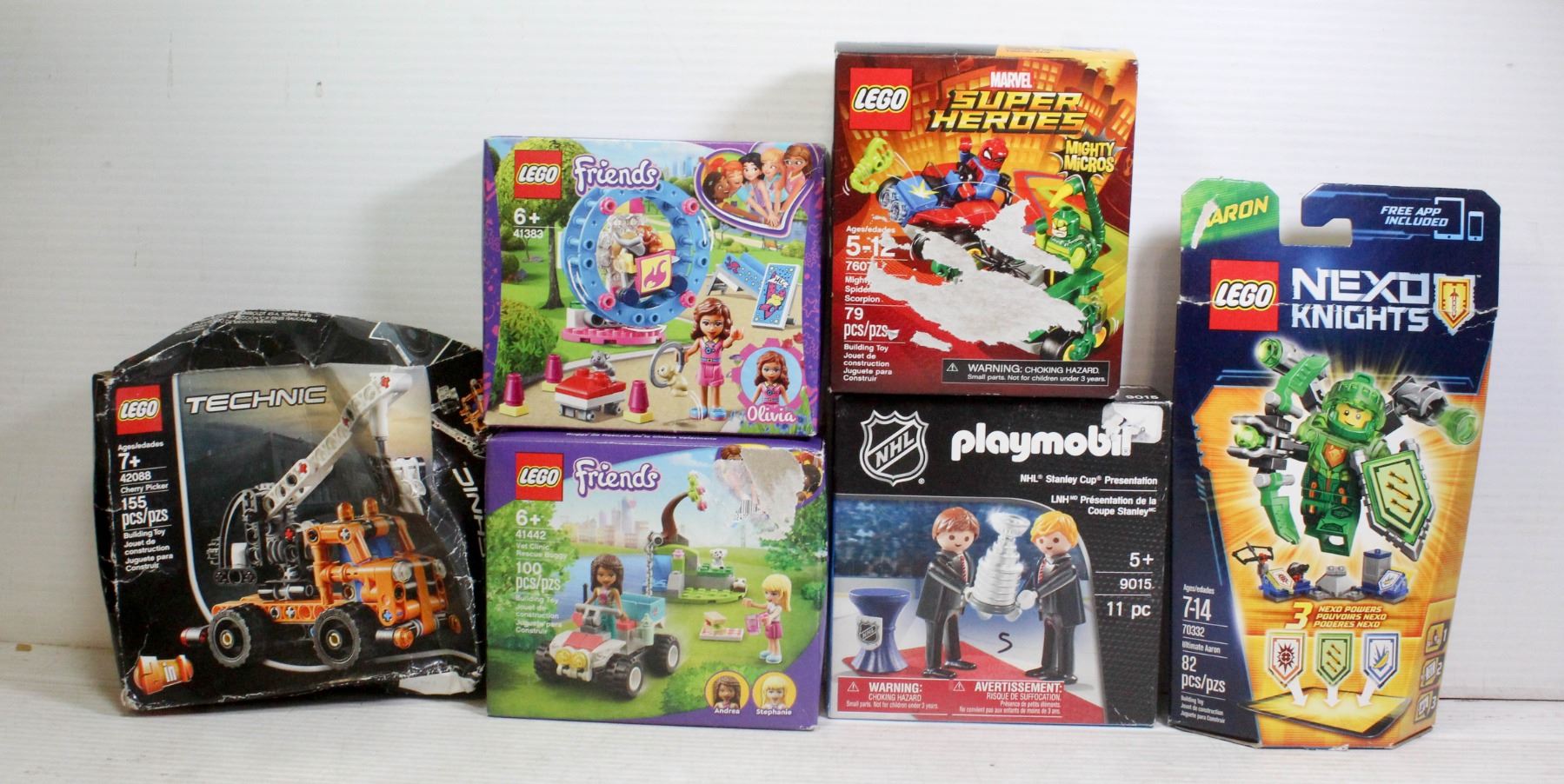 #70332, TECHNIC CHERRY PICKER #42088, FRIENDS 41383 & 41442, SUPER HEROS #76071 SUPER HEROS W/ 1 PLAYMOBILE (SOME DAMAGED TO BOX'S)