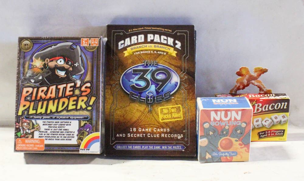 GAME PIRATE'S PLUNDER! W/THE GAME OF MAKEIN BACON DICE GAME & SCHOLASTIC THE 39 CLUES CARD PACK GAME CARDS