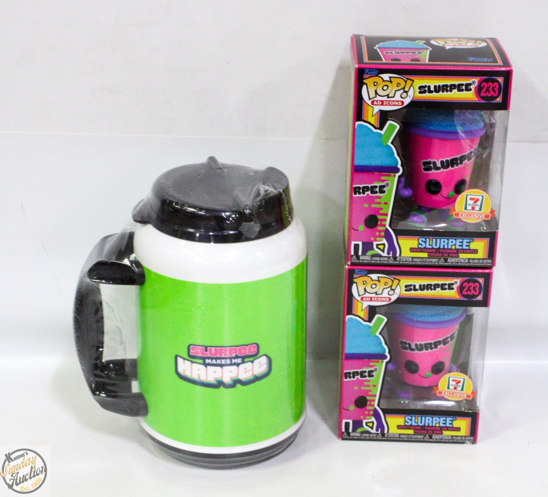 ICONS SLURPEE EXCLUSIVE VINYL FIGURES & WHIRLEY LARGE TRAVEL MUG "SLURPEE MAKES ME HAPPEE **ALL ITEMS MUST BE REMOVED BY 5PM SATURDAY, NOVEMBER 22ND 2025. ALL REMAINING ITEMS WILL BE SUBJECT TO A $6.00 PER DAY STORAGE CHARGE. ANY ITEMS REMAINING AFTER MONDAY, DECEMBER 8TH 2025 WILL BE CONSIDERED FORFEITED. NO REFUNDS WILL BE ISSUED FOR FORFEITED ITEMS. TO SCHEDULE A PICK UP APPOINTMENT CLICK HERE