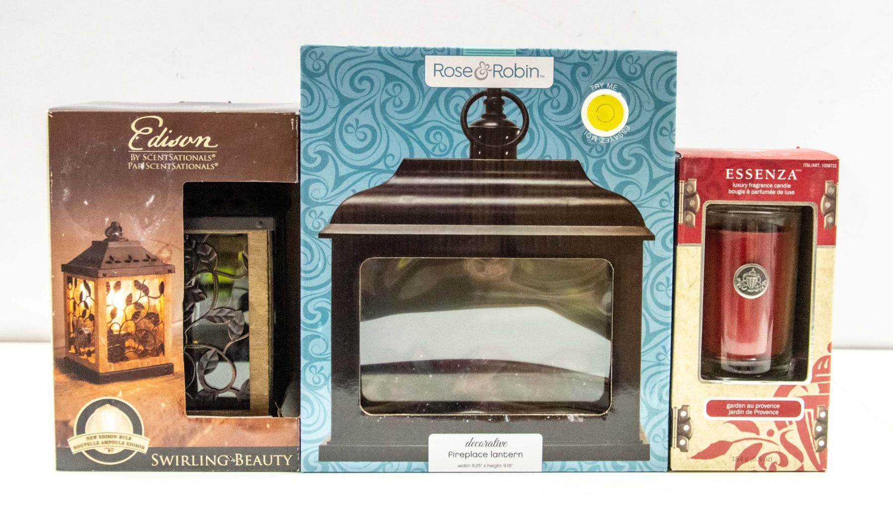 LANTERN W/SEALED ESSENZA LUXURY CANDLE SET 4PK ASSORT SCENTS IN GLASS JAR & EDISON SCENTSATIONALS WARMER SWIRLING BEAUTY **ALL ITEMS MUST BE REMOVED BY 5PM SATURDAY, DECEMBER 3RD, 2022. ALL REMAINING ITEMS WILL BE SUBJECT TO A $6.00 PER DAY STORAGE CHARGE. ANY ITEMS REMAINING AFTER MONDAY, DECEMBER 18TH, 2022 WILL BE CONSIDERED FORFEITED. NO REFUNDS WILL BE ISSUED FOR FORFEITED ITEMS. TO SCHEDULE A PICK UP APPOINTMENT CLICK HERE