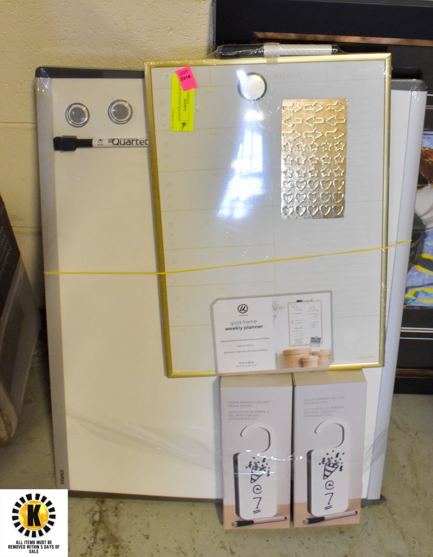 DRY ERASE BOARD 18" X 24" W/NEW (2) DOOR HANGERS LED DRY ERASE BOARD & GOLD FRAMED WEEKLY SCHEDULE BOARD