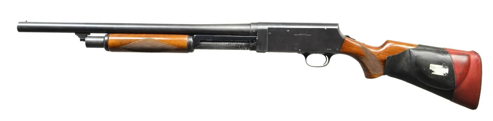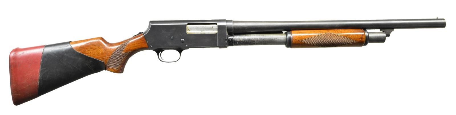 Cal. 12GA. S# 22881. Bbl. 20". Mfg. 1934-1936 A rugged pump action shotgun based on the Browning "Hammerless" technology of the day. 2 3/4", 12ga, 20" cut barrel w/ silver bead sight. Single action bar. Hardwood checkered forend & stock. Blued finish w/ rear tang safety. Slip on recoil pad & cheek riser. CONDITION: Still retains a large amount of what appears to be original finish w/ typical thinning in areas of mechanical intervention, such as feed tube & action bar. Bright barrel. Fire control mechanism appears to function correctly when cycled by hand. Unable to classify as Curio due to modern modifications. (22-3222/JZ). MODERN. $100-200