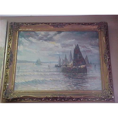 Very well executed 19th Century Antique Seascape Oil on Canvas Art Painting depicting several sailboats in a harbor with a background of clouds and landscape. Signed "Malaspina"