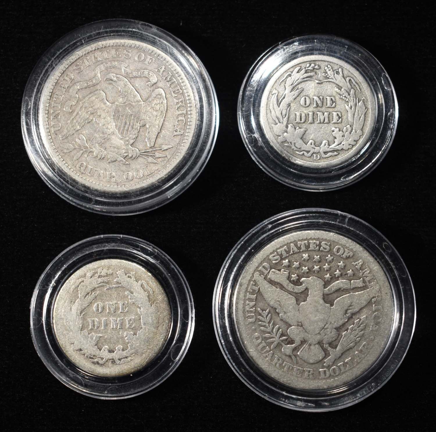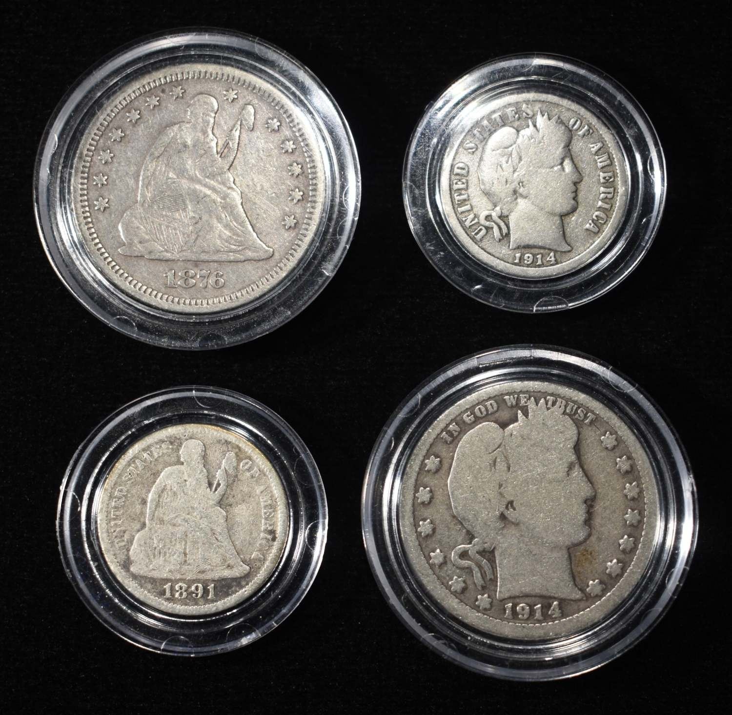 1891 DIME, 1876 QUARTER, 1914-D DIME, 1914 QUARTER ESTIMATE $80 - $100.