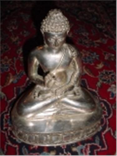 SEATED BUDDHA IN THE LOTUS POSITION MARKED "SIAM SILVER". 12" X 9.5" X 7".