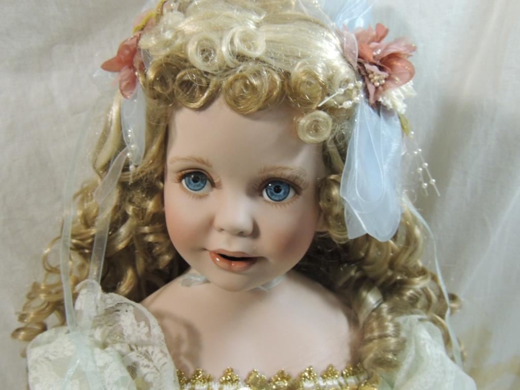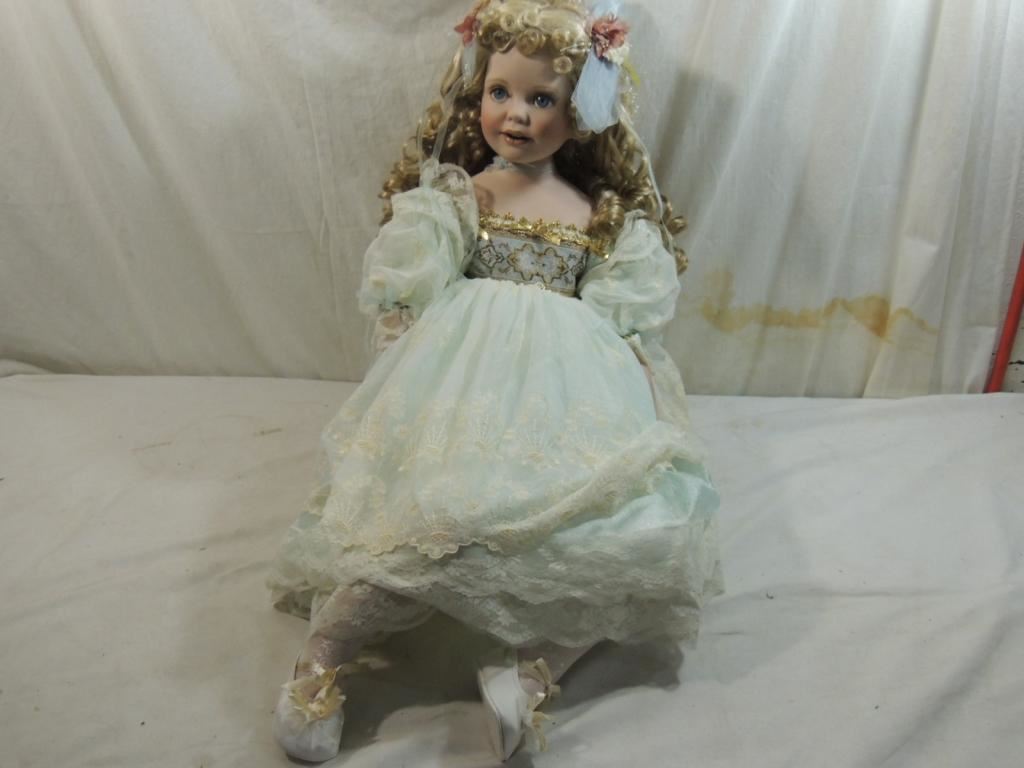 LACE SATIN BLUE DRESS OLLECTIBLE DOLL, LARGE DOLL, FROM PRIVATE DOLL COLLECTION, DESIGNER DOLL, AS SHOWN SEE PHOTO FOR MORE DETAILS.