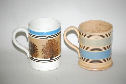 SEAWEED BANDED & BANDED MOCHAWARE MUGS - (2) CREAMWARE MOCHA MUGS: (1) 4" PUTTY BANDED MUG W/ SEAWEED DECORATION & BLUE & THIN BROWN BANDS (RIM CHIP) & (1) 3 1/2" DOUBLE BLUE BANDED MUG W/ THIN BROWN BANDS (HAIRLINES, REPAIR, CRAZING, STAINS)