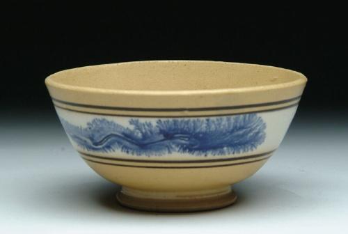 SEAWEED DECORATED YELLOWARE BOWL. Small footed bowl has central cream band with seaweed. Bordered on each side by two brown bands. SIZE: 2-3/4in. h x 5-1/4in. dia. CONDITION: Very good. 9-25997