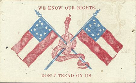 Scarce "secession card", 3 1/8" x 2", shows crossed Confederate First National flags and a serpent with the legend: "WE KNOW OUR RIGHTS DON'T TREAD ON US". Slight offsetting, else very good.