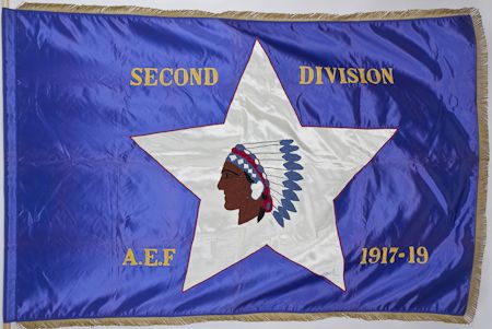 Beautiful satin-like two-sided parade flag from the 2nd Infantry Division, likely used between the two world wars, 66" x 44", bearing extensive embroidery featuring the division's Indian head emblem. Lettering on one side reads: "Second Division A.E.F. 1917-1919" while the other side lists some of the division's bloody engagements during World War I: "Chateau Thierry Saint Mihiel Soissons Mont Blanc Meuse Argonne". The gold-fringed flag bears a 3" square area of light waterstaining near one edge, but is otherwise fine.