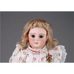 SECOND SERIES PORTRAIT JUMEAU. A fine example of a second series portrait marked with a “4” in neck socket and still retaining original spring in head. Doll has large amber eyes, mauve eye shadowing and fine bisque. She is on an eight ball-jointed Jumeau body wearing a newer French-styled cotton print dress. She has original antique shoes with buckles and a blonde mohair wig. CONDITION: Cork pate has not been removed but bisque head has been inspected and appears to be free of damage. Lower straight-wristed arms are incorrect. JL 1-2259