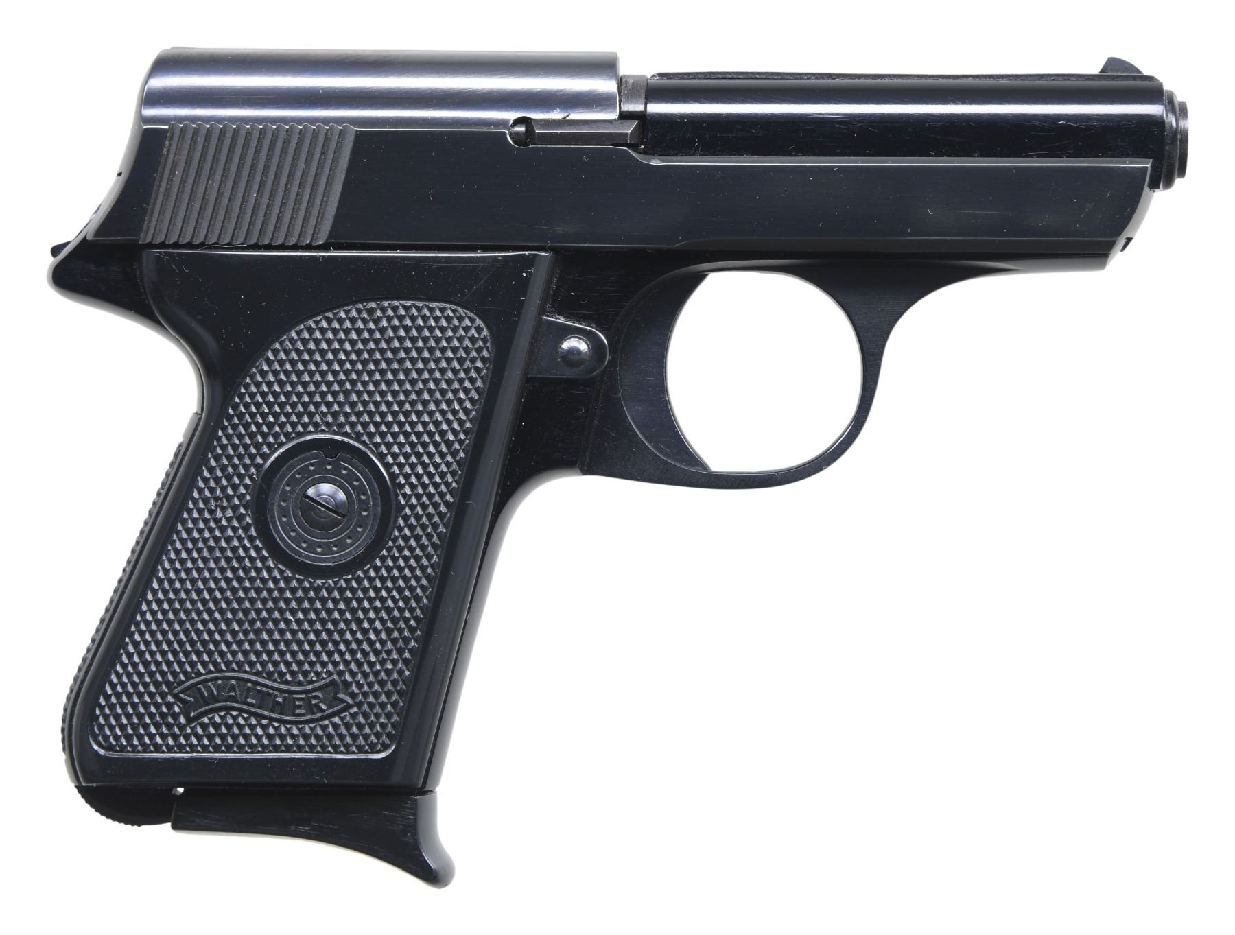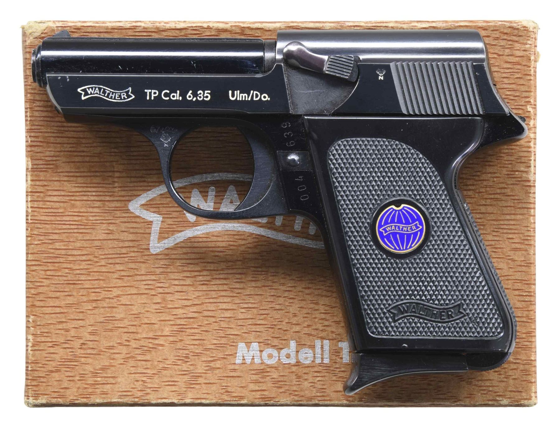 PISTOL WITH MATCHING FACTORY BOX. Cal. 6.35mm. S# 004639. Bbl. 2 5/8". Model TP semi-automatic pistol mfg. in Germany by Walther. Left side of the slide is marked with the Walther banner logo, followed by "TP CAL. 6,35 Ulm/Do.", followed by an Eagle/N commercial nitro proof. Left side of forward trigger web is marked "67", followed by a Ulm Proof House antler, above an Eagle/N proof. Aluminum frame and bbl. shroud exhibit a black anodized finish, with the slide and remaining steel components exhibiting a blue finish. Frame is mounted with 2-piece checkered black synthetic Walther banner grips, with the left panel featuring an inlaid Walther banner medallion. Fixed blade front sight with fixed U-notch rear sight. MAGS: 1 6-rd. with black synthetic grip extension. UNATTACHED ACCESSORIES: matching factory box containing manual. CONDITION: metal components retain bountiful amounts of their original factory finishes, showing some superficial marks, primarily on the left side of the slide and bbl. shroud. Mirror bore, retaining well defined rifling throughout. Action functions appropriately when cycled by hand. Grips are very good overall, with some light handling marks. Box shows mild exterior wear, save for a tear that is present on 1 corner of the lid. (25-3547/MLW). CURIO. $1,200-1,800.