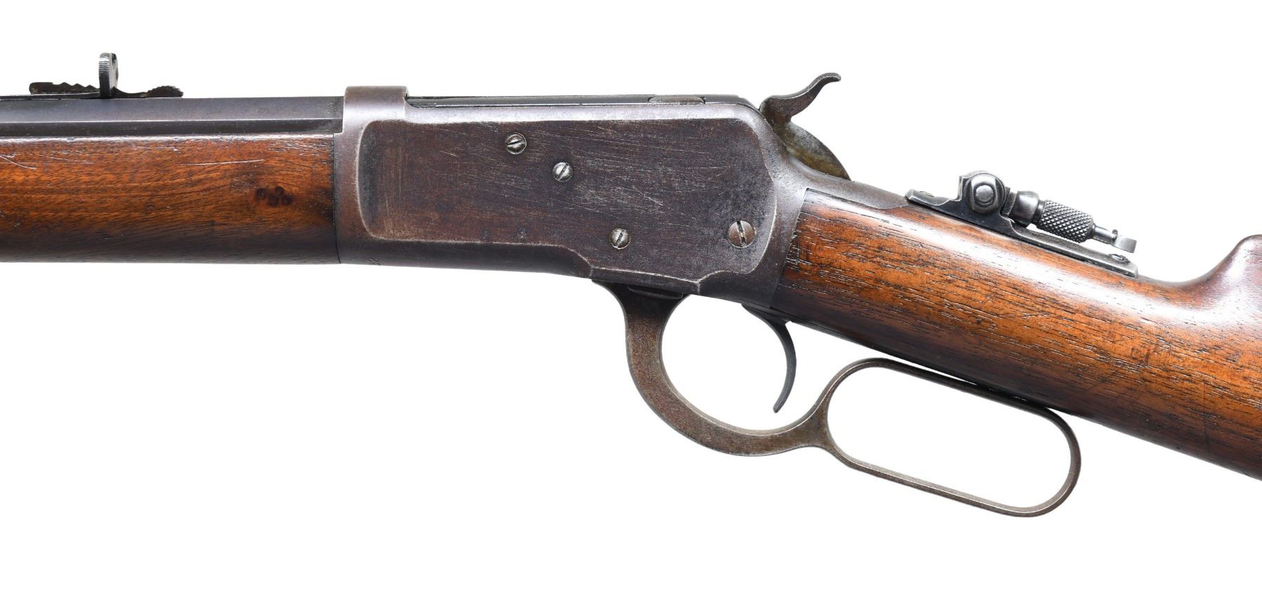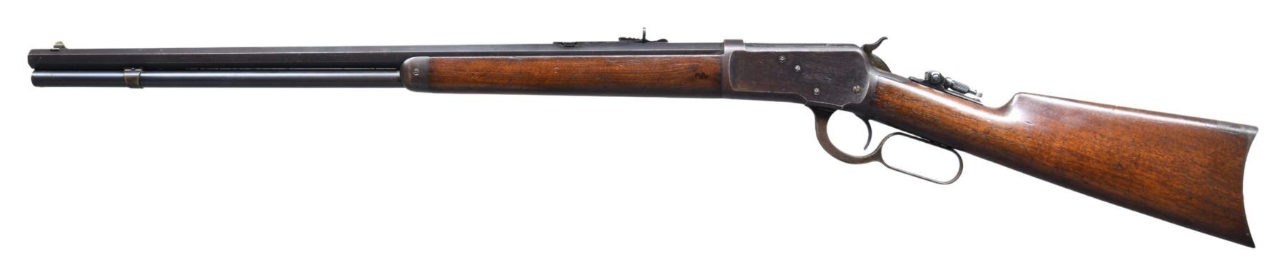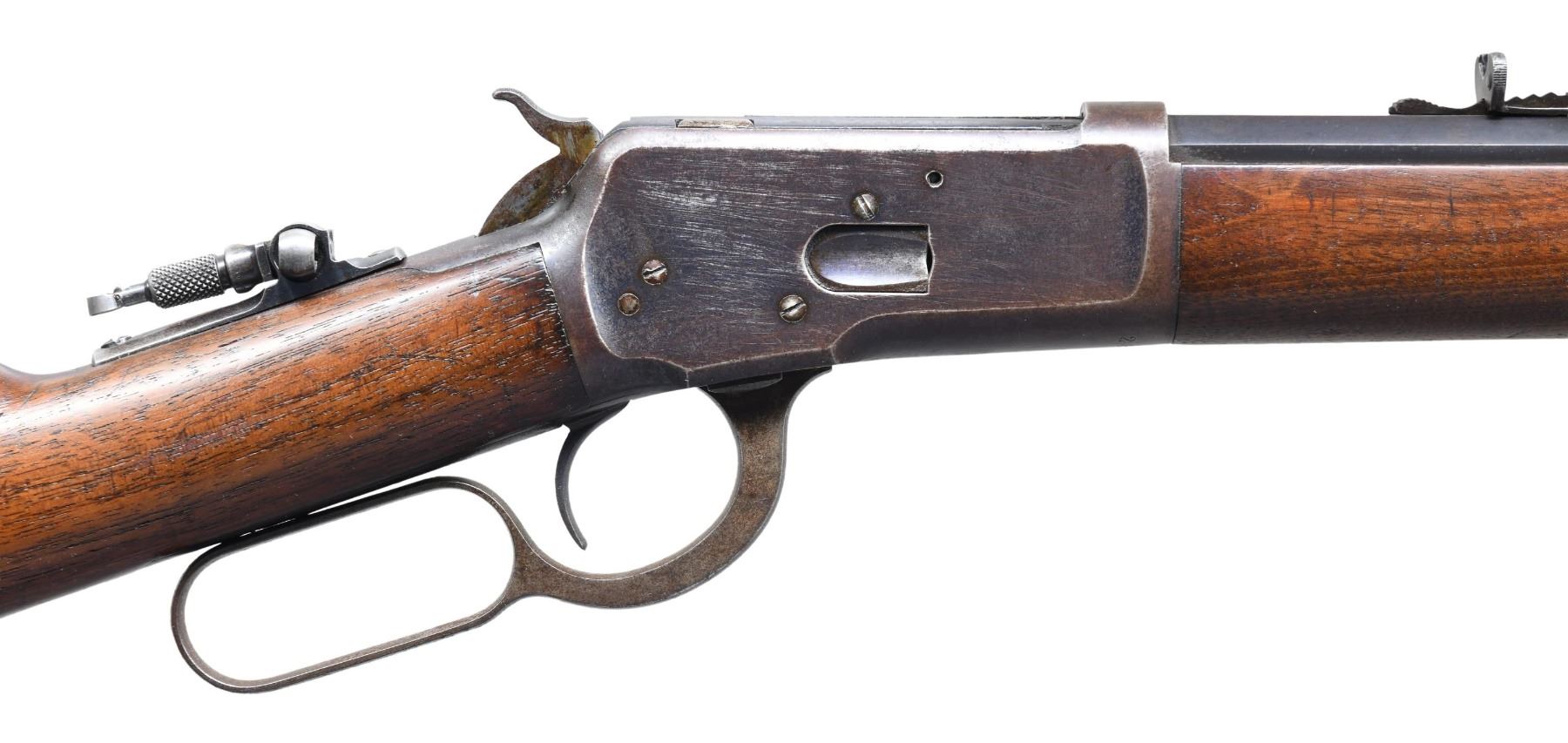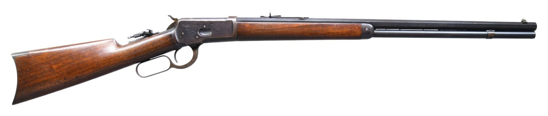 LEVER ACTION RIFLE. Cal. 44 WCF (44-40). S# 28322. Bbl. 24" octagon. Original sights with Lyman "D" tang sight. Full length mag. Blue finish, with case colored hammer and lever. Walnut forearm and straight grip stock, with crescent steel buttplate. Mfg. in 1893. CONDITION: 50% dull blue fading to brown, showing light surface freckling and spots of very light pitting. Hammer and lever show faint traces of case colors. Buttplate shows some light surface oxidation. Original wood finish shows wear, with numerous scratches and marks. Sound mechanics. Bore is generally bright with strong rifling showing scattered light pitting. (01-27072/DS). ANTIQUE. $3,000-4,000