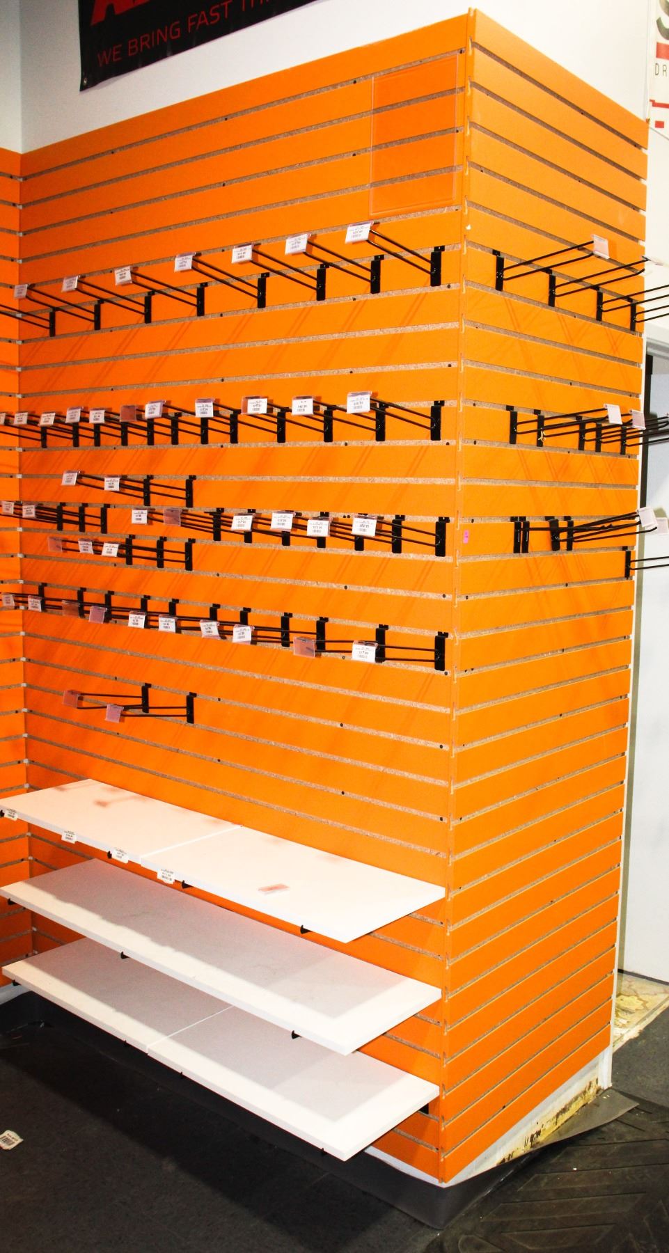 PANELING WITH PEGS AND SHELVES. ATTACHED TO WALL WITH PHILLIPS SCREWS. BUYER RESPONSIBLE TO REMOVE