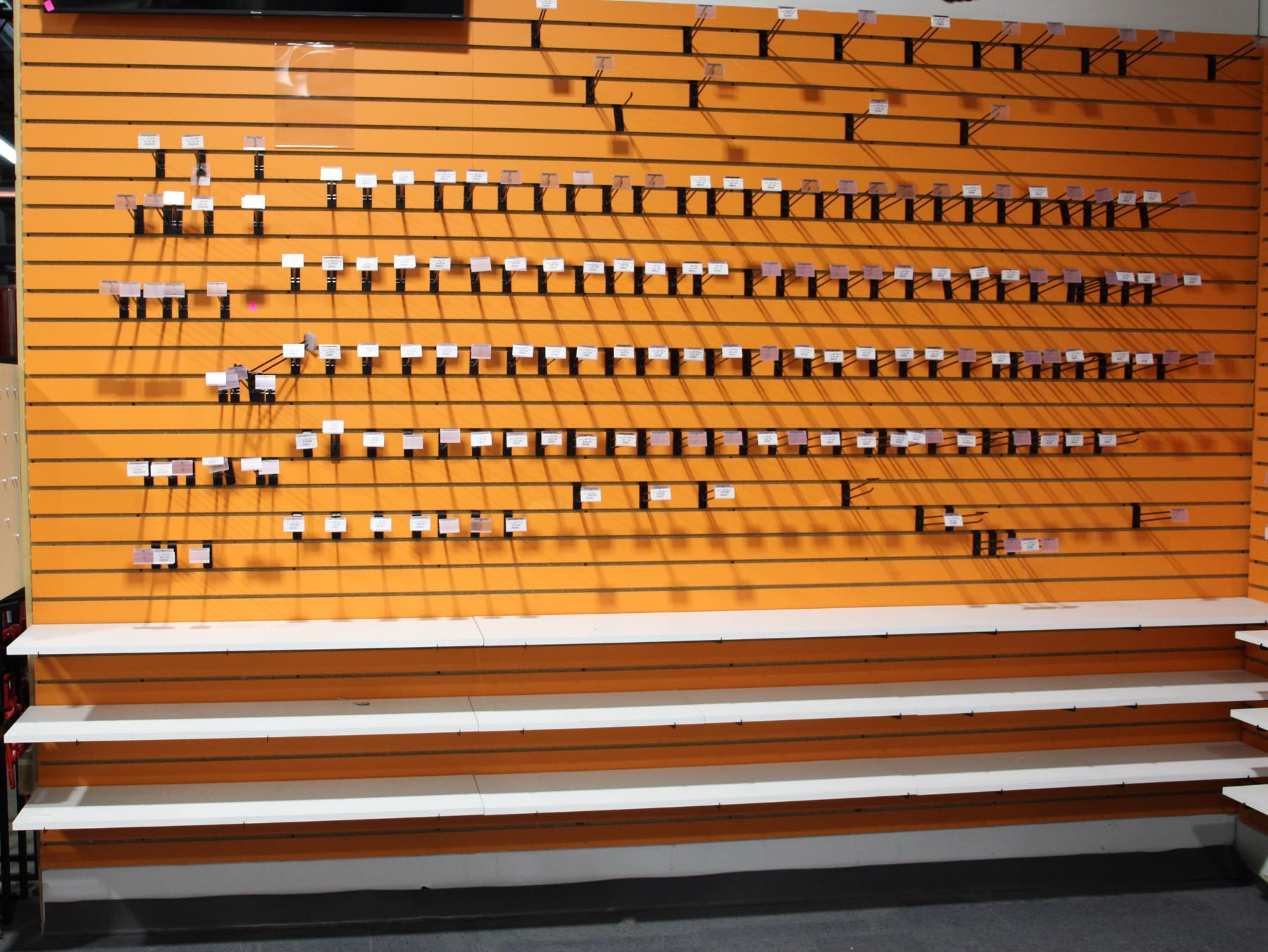 PANELING WITH PEGS AND SHELVES. ATTACHED TO WALL WITH PHILLIPS SCREWS. BUYER RESPONSIBLE TO REMOVE