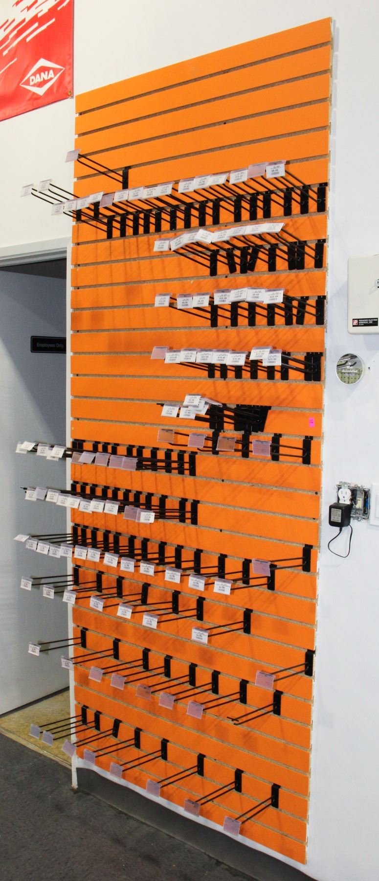 RETAIL PEG HOLDER. PEGS INCLUDED. ATTACHED TO WALL WITH PHILLIPS SCREWS. BUYER MUST BRING OWN TOOLS AND REMOVE THEMSELVES