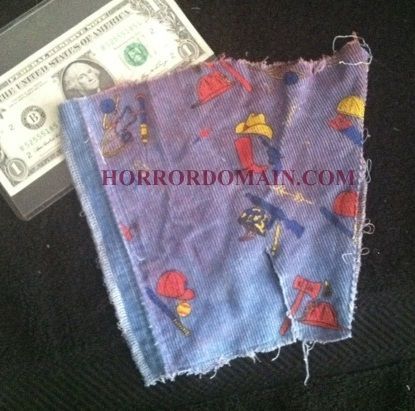 This is a huge swatch of bloody hero Chucky overall pant leg that was worn on the chopped up Chucky puppet. It shows most of the good guy icons, and is saturated in Chucky's blood.