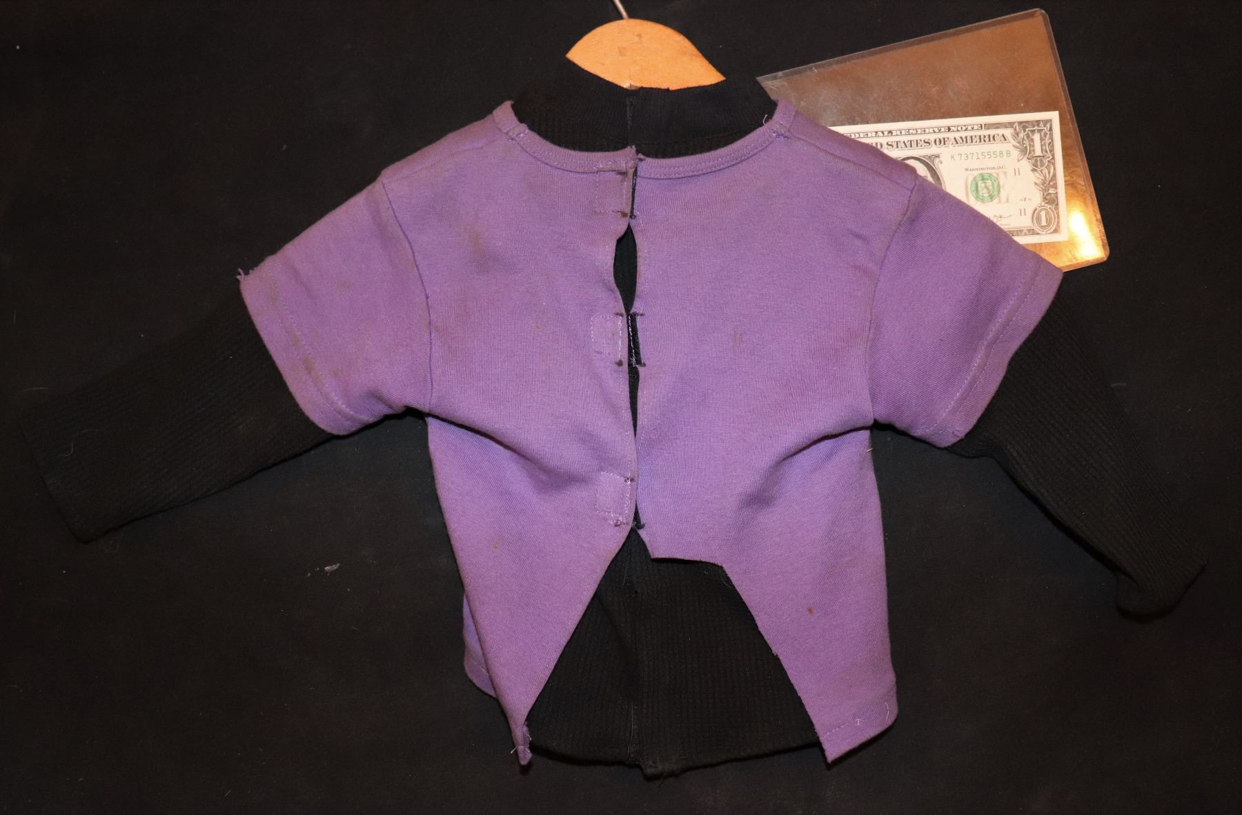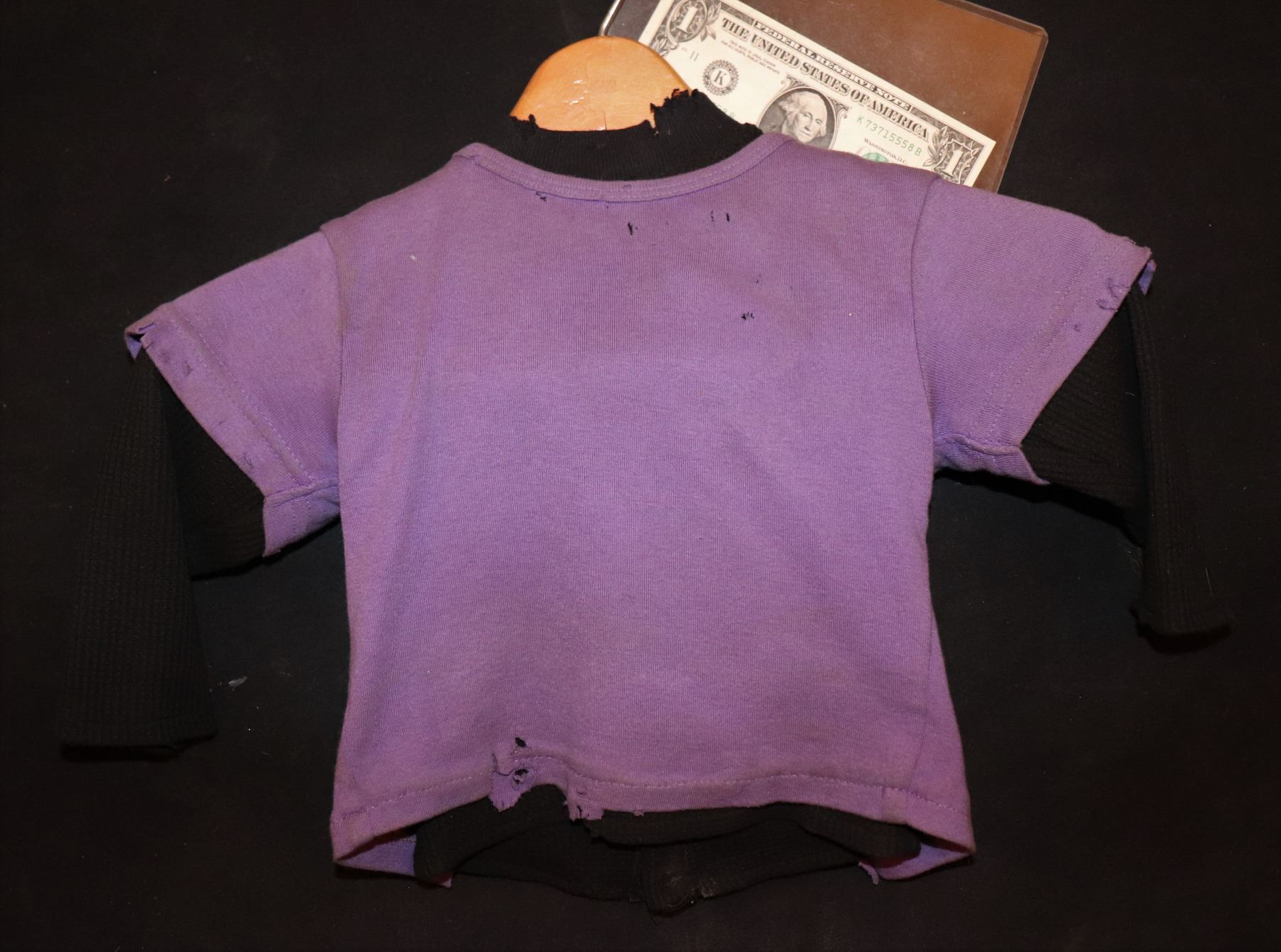 This is a Screen Used Tee Shirt and Sweater worn on the Hero Glenn Puppet in SEED OF CHUCKY. Both have velcro to seal up rear. This is the shirt and sweater worn in the pissing pants scene. The cut out is for the cables to come out rear, as apposed to down through the floor.
