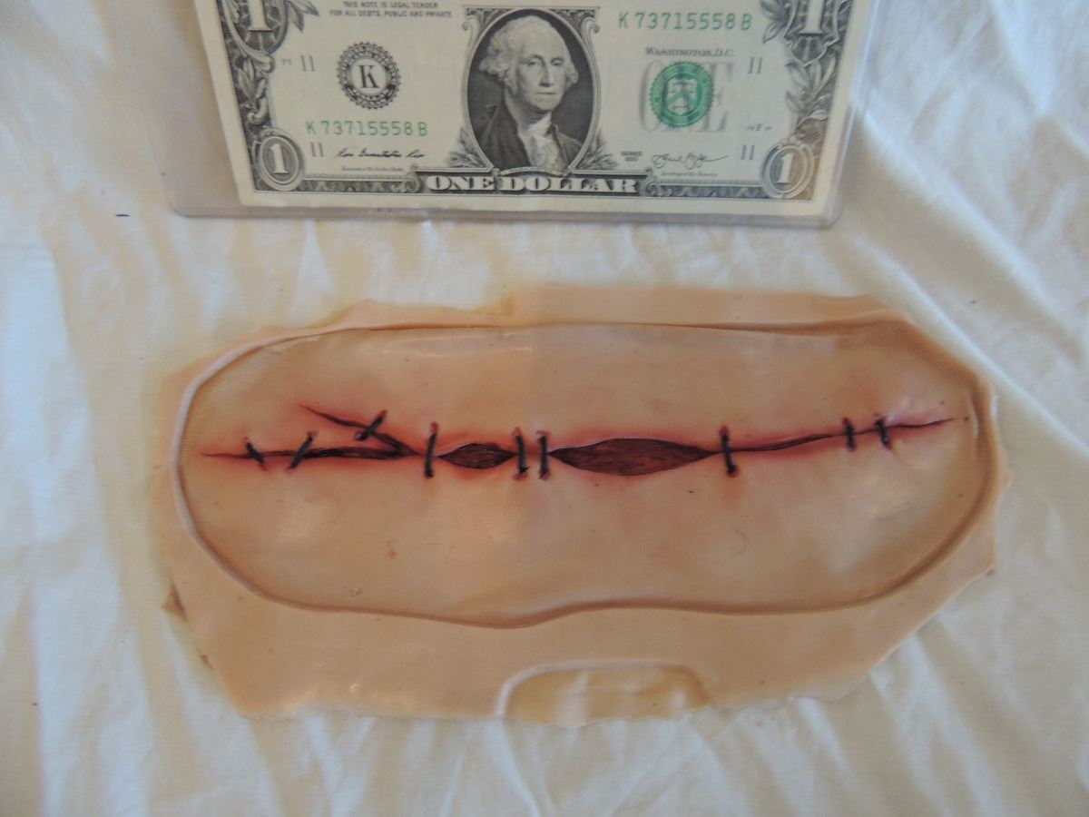 This is a production made Silicone leg scar with stitching from SEED OF CHUCKY!