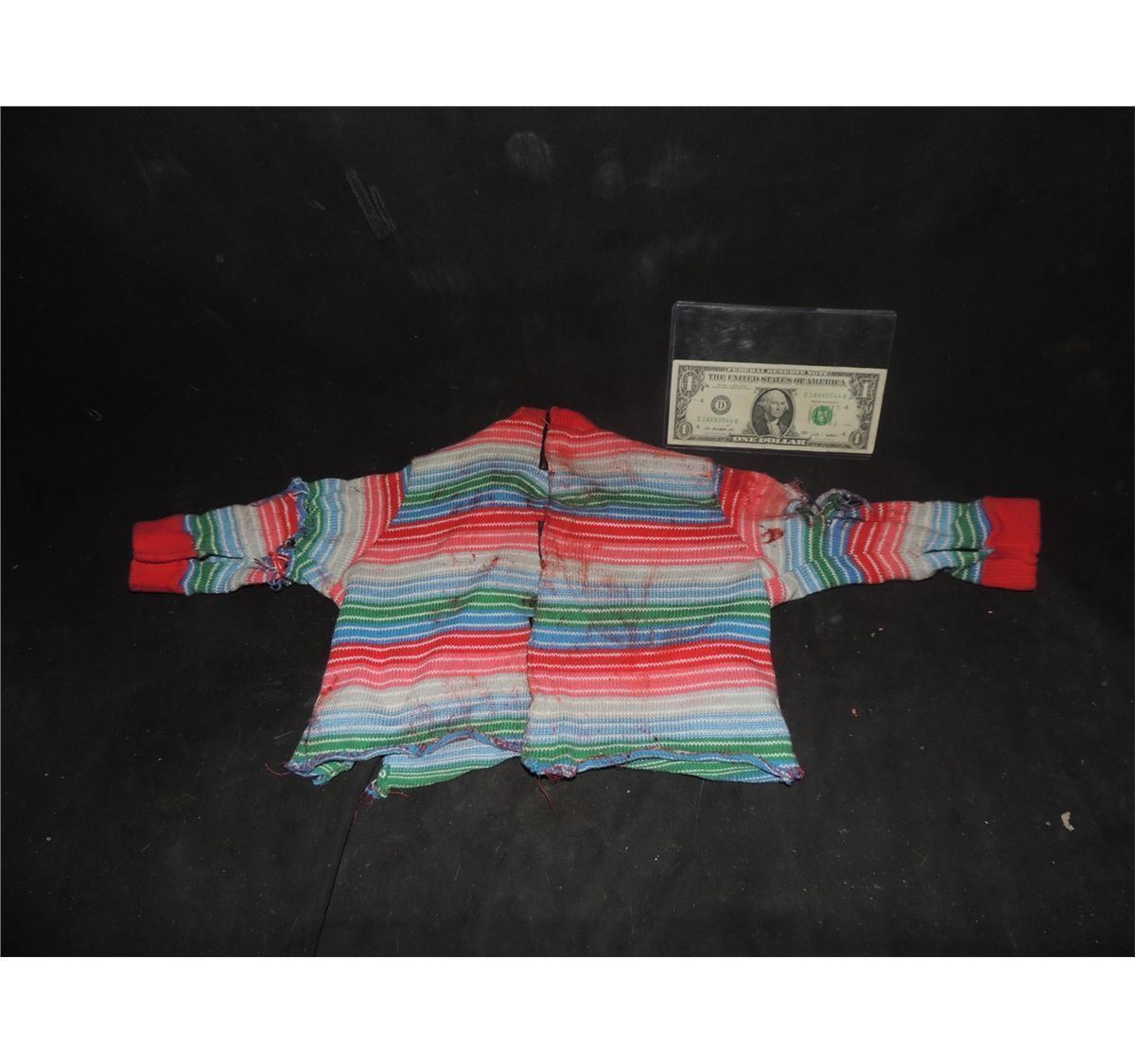 This is the screen used, puppet worn Hero bloody sweater seen as Chucky first gets struck by the axe in SEED OF CHUCKY.