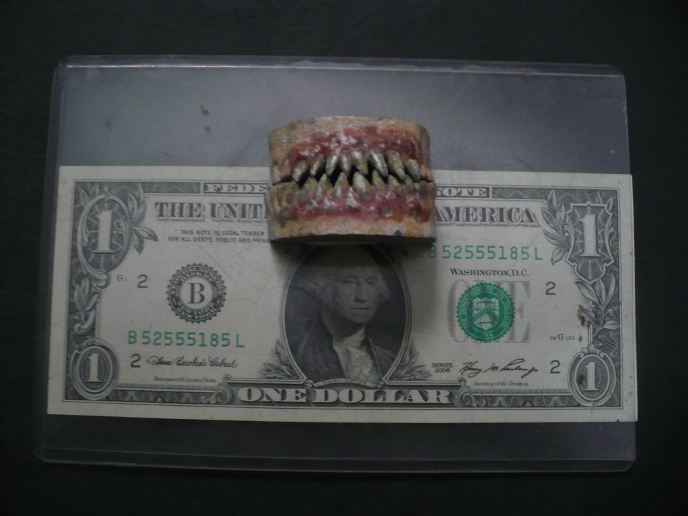 These are screen used Glen/Glenda teeth. They are the upper and lower teeth bonded together used in the static hero doll seen in SEED OF CHUCKY. Looks to be some sort of stone resin palates with acrylic denture construction. Very cool sculpt. The only other set in existence is in the Hero animatronic puppet.