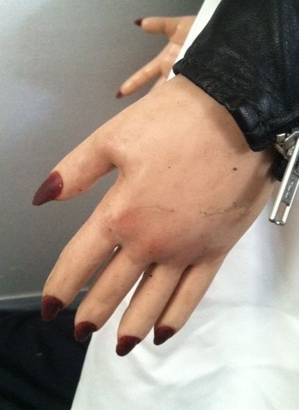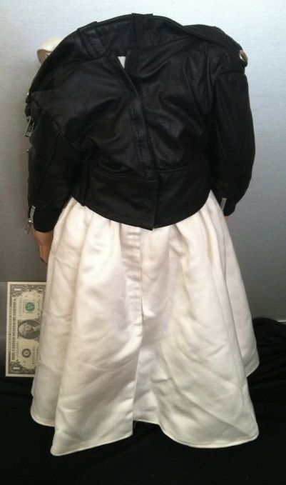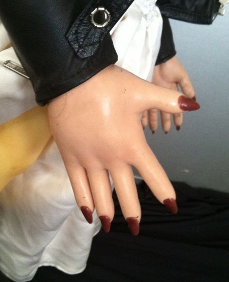 "Still has the original dress and real leather jacket as seen on film" with a drop or two of blood still on the dress. The hands are Screen Used as well, but may not be original to this doll. The shoes are unused production made back ups, and do not have laces. I added the hands and shoes to complete the display as much as possible. Short of the silicone breasts and scarred head which were destroyed during filming, this is the complete doll as seen on film.