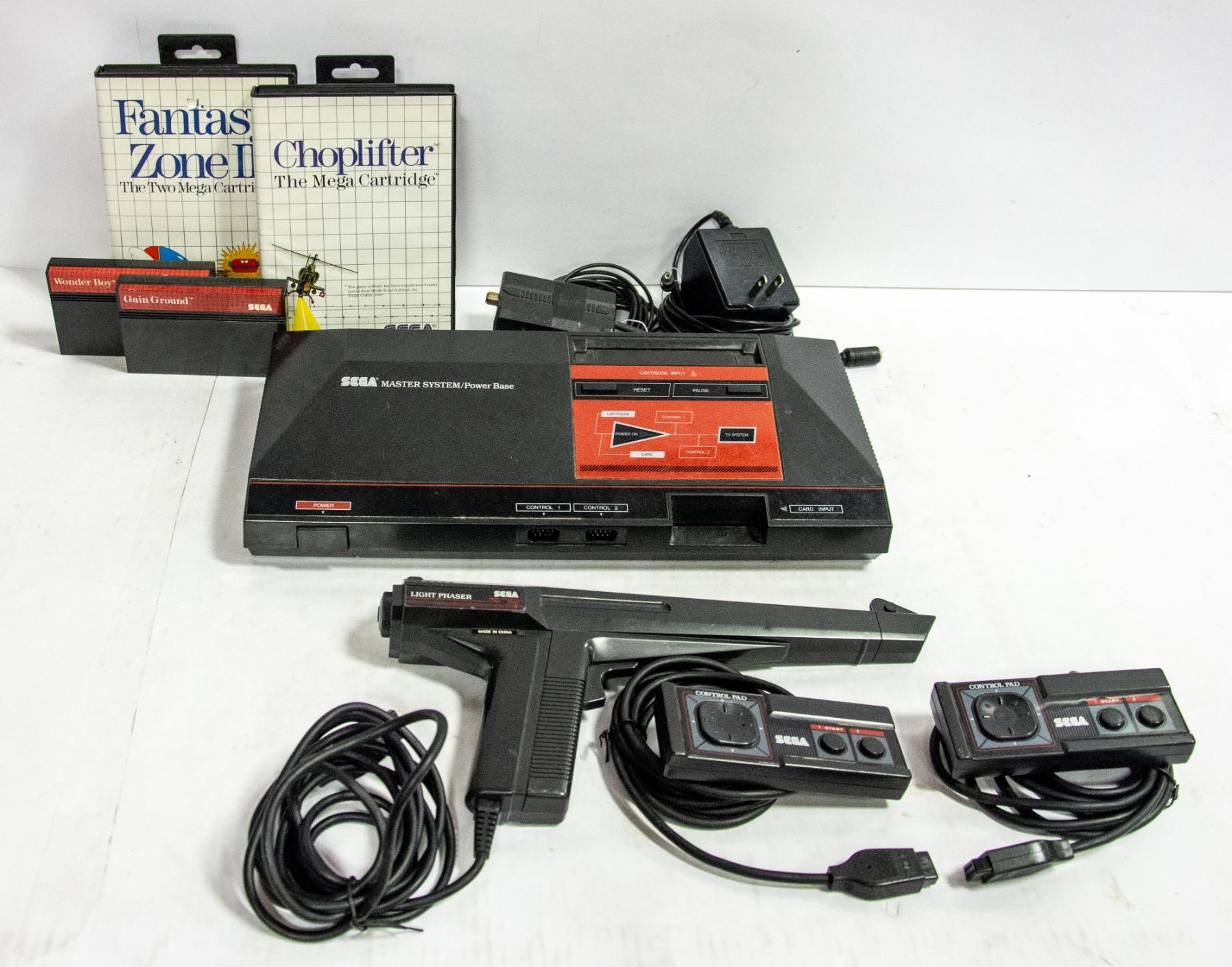 COMES WITH 2 CONTROLLERS, 1 GUN, HOOKUPS, CHOP LIFTER, FANTASY ZONE II, WONDER BOY, GAIN CONTROL