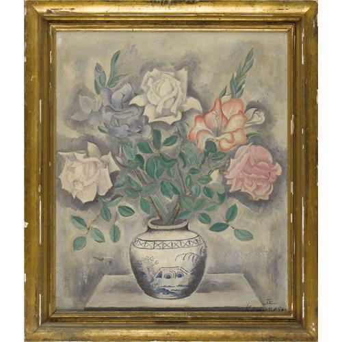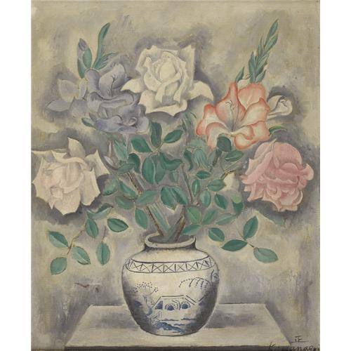 <B>SEI KOYANAGUI</B></I> (Japanese b.1896)<BR><I>Still Life With Roses In A Delft Jar</B></I><BR>Oil on canvas<BR>25-3/4 x 21-1/2 inches (65.4 x 54.6 cm)<BR>Signed lower right:<I> (artist's monogram)/Koyangagui</B></I><BR><BR><BR><BR><b>Shipping:</b> Requires 3rd Party Shipping (<a target="_blank" href="http://www.heritageauctions.com/common/shipping.php">view shipping information</a>)