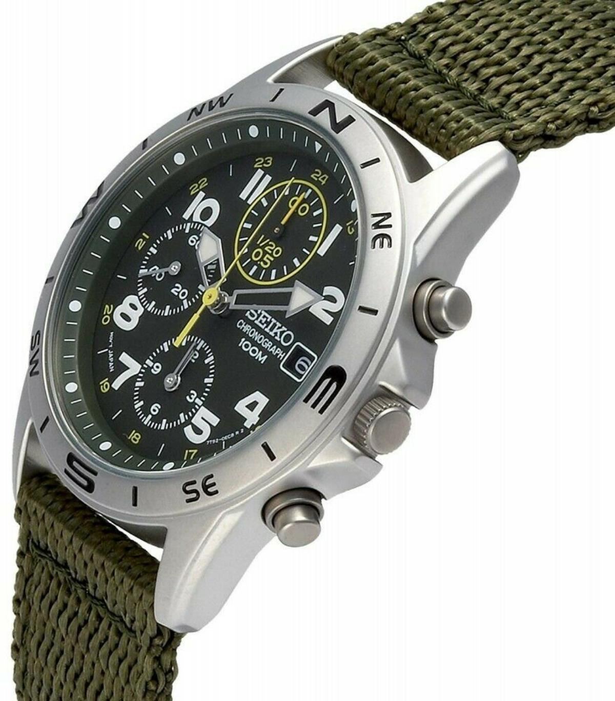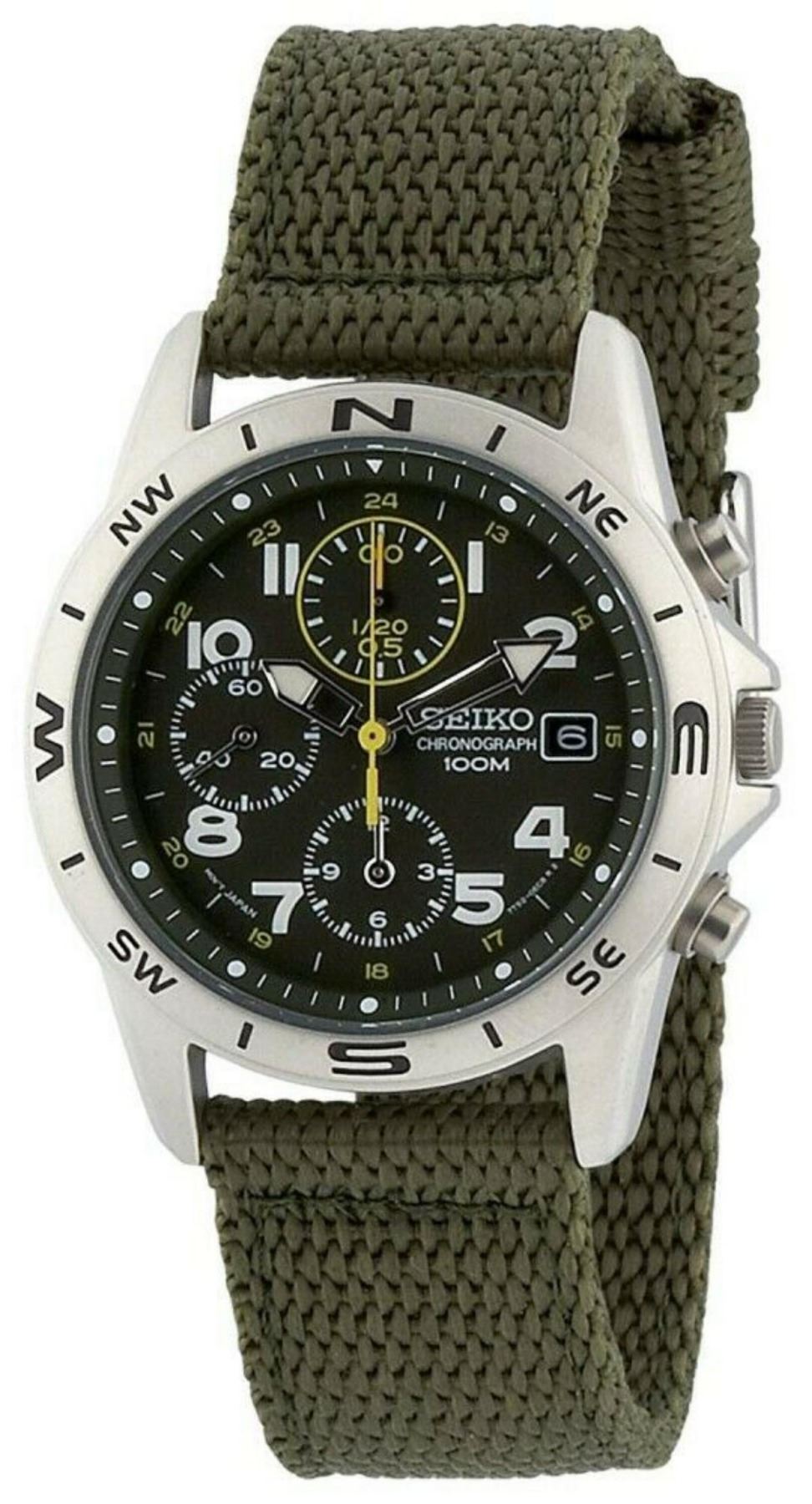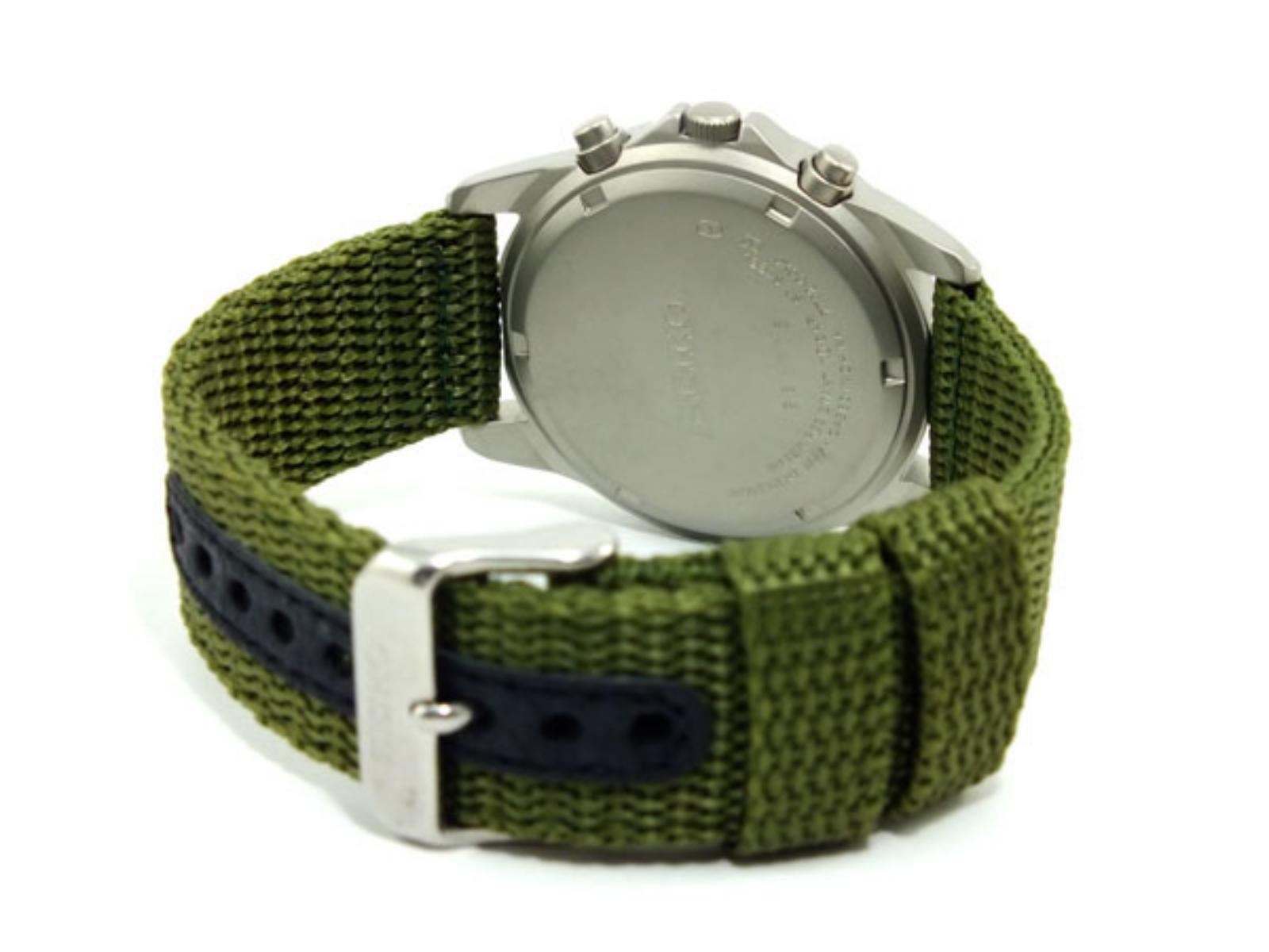 Brand SEIKO....Case shape round face-Display Type Analog Display;Case material Stainless steel;Case diameter · width 39 mm;Case thickness 10 mm;Band Material · Type Cross;Band length around arm Maximum about 19 cm;Band width 20 mm;Band color khaki;Dial Color Green;Calendar function Date calendar;Other functions Small second;Body weight 54 g;Movement quartz;Waterproof pressure 100 m;