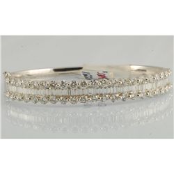 Baguette diamonds set in 18K white gold bangle with rows of round diamonds accenting baguettes. Diamond 6.73 total weight 27.86 grams.