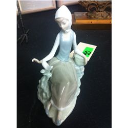 Collectors item! Stamped Lladro on the bottom base, porcelain lady with bird. Slight friction on the neck. Repaired. 7.5" x 7".