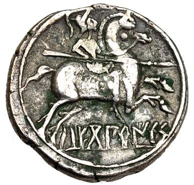 SEKOBIRIKES, saelices (cuenca). Denario. R/ Jinete con un solo pie visible. AR 3,71 g. I-2168. VILL-292/5. MBC-/MBC.