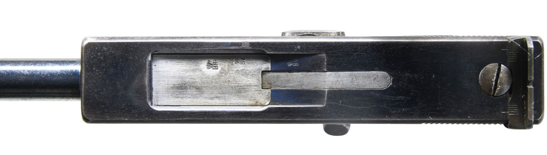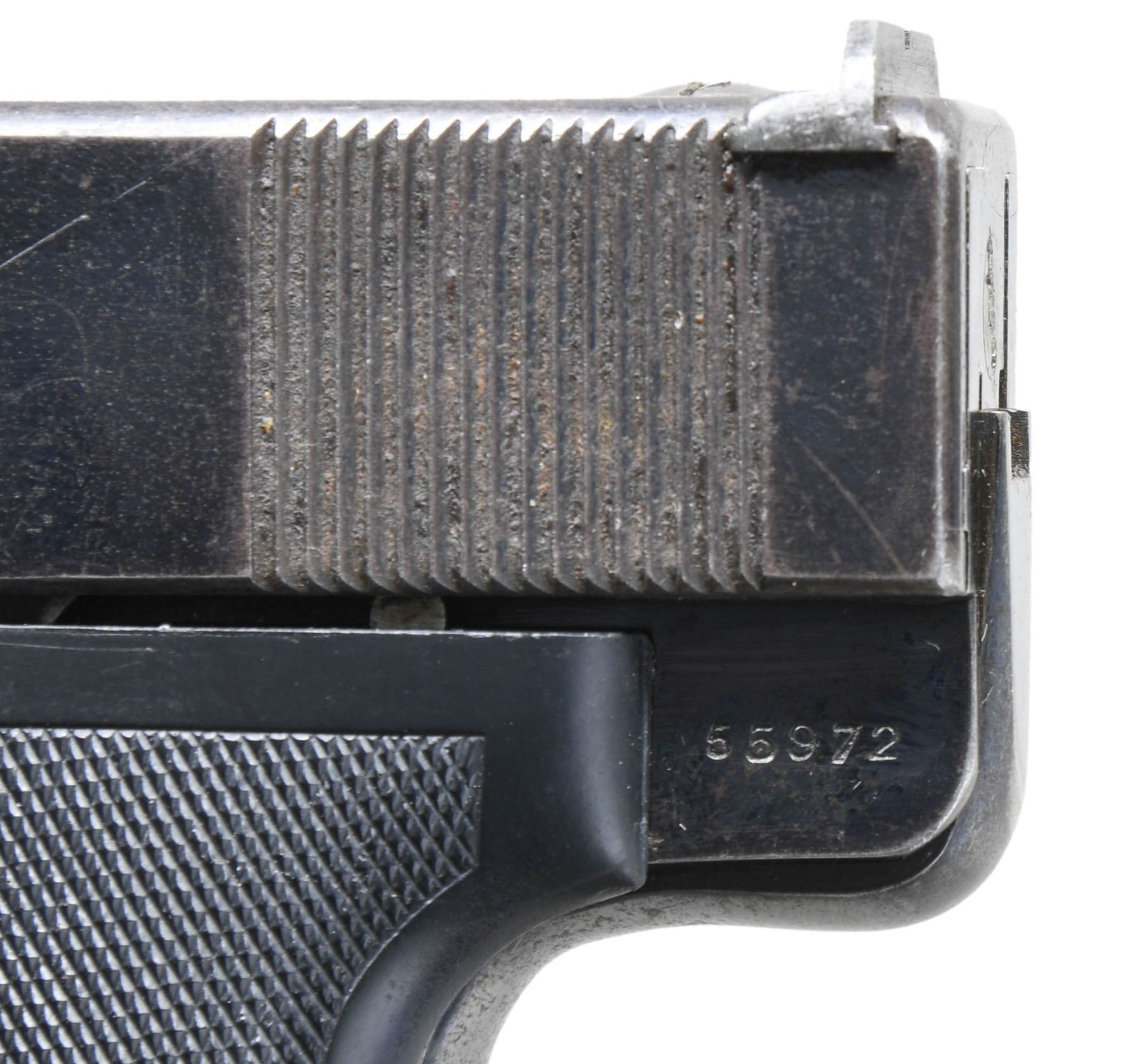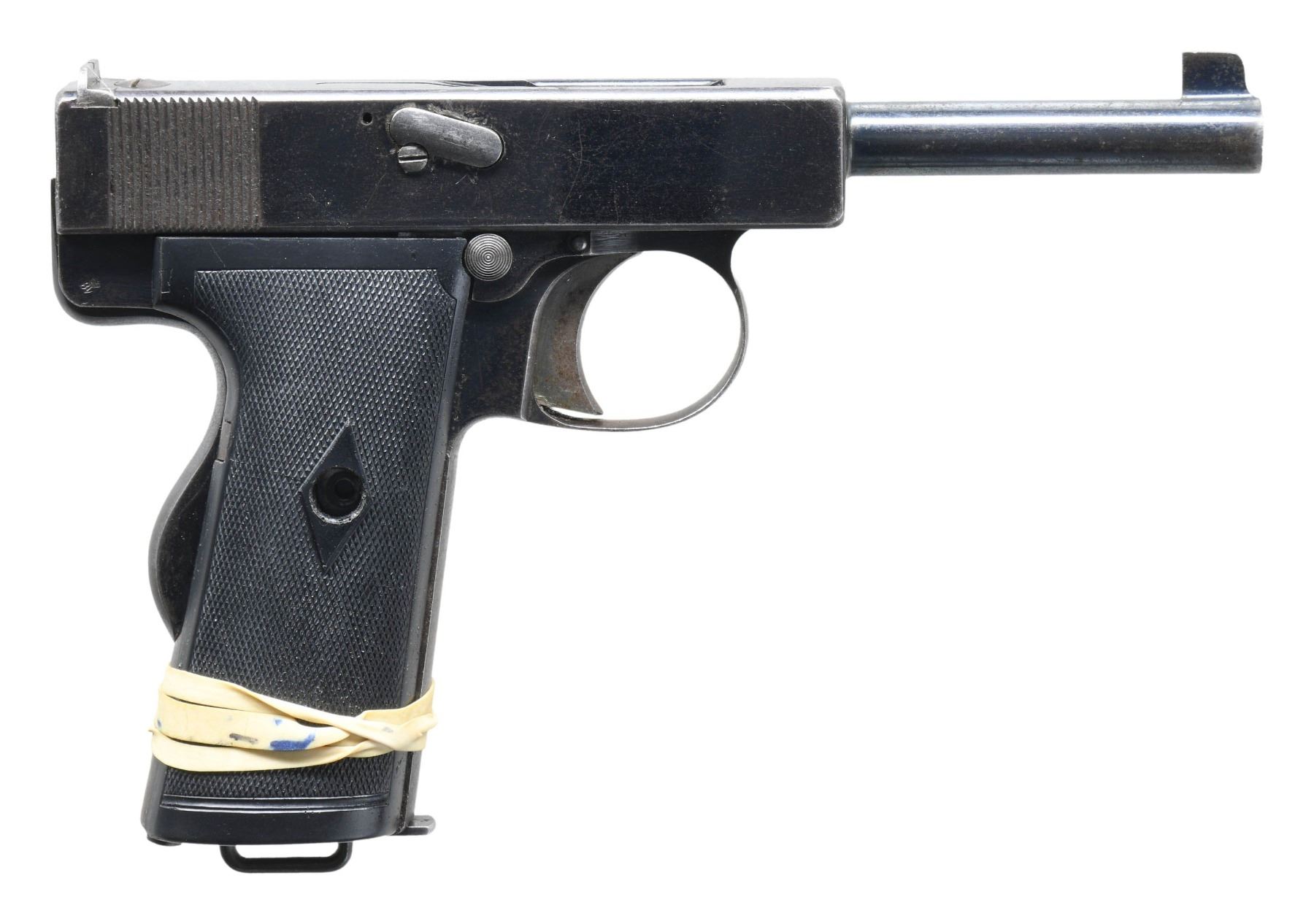 TYPE I SEMI-AUTOMATIC PISTOL. Cal. 38 Auto. S# 55972. Bbl. 5". Model 1910 semi-automatic pistol falling within the "Type I" variation S# range of 55700-56000 (just 27 S#s away from the highest recorded Type I S# "55999") as found on page 179 of "Webley & Scott Automatic Pistols" by Bruce Gordon. Left side of the slide is marked with the Webley & Scott winged bullet logo, followed by "WEBLEY & SCOTT LTD/ LONDON & BIRMINGHAM/ .38 AUTOMATIC PISTOL". Frame, slide, and bbl. exhibit British commercial proofs. Metal components exhibit a high polish blue finish overall, save for on the trigger and extractor, which exhibit a nickel plated finish. Frame is mounted with 2-piece checkered black vulcanite grips, each inscribed "W39" on the interior of the panels, and features a lanyard ring mounted on the left side beneath the grip panel. Grip screws are absent. Slide features the long pattern extractor and large pattern rear sight adj. screw. Integral blade front sight with horizontally adj. U-notch rear sight. Interior of slide matches the frame via "972". Underside of bbl. is stamped "2", which is also present on the left side of the frame beneath the grip panel. MAGS: 1 8-rd. with 7 transverse indicator holes. CONDITION: metal components retain large amounts of their original factory blue finish, exhibiting mild edge wear, scattered superficial handling marks, and scattered spots of light surface oxidation overall. Sides of frame exhibits small spots and patches of moderate pitting beneath the grip panels. Top flat of the breech has faded to a gray patina. Front face and edges of trigger have worn to a gray patina. Near mirror bore, exhibiting what appears to be some light pitting and hardened grease, while retaining strong rifling throughout. Proper manual mechanics. Grips show light to mild wear, with some superficial handling marks overall. Approx. 930 Model 1910 .38 Automatic pistols were produced between all 3 variations, with the Type I variation production consisting of only approx. 55 pistols in total. A rare opportunity for the advanced Webley & Scott automatic pistol collector to acquire a Model 1910 Type I pistol. (25-5035/MLW). CURIO. $800-1,400.