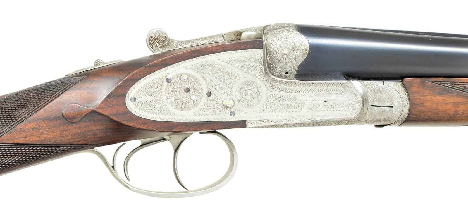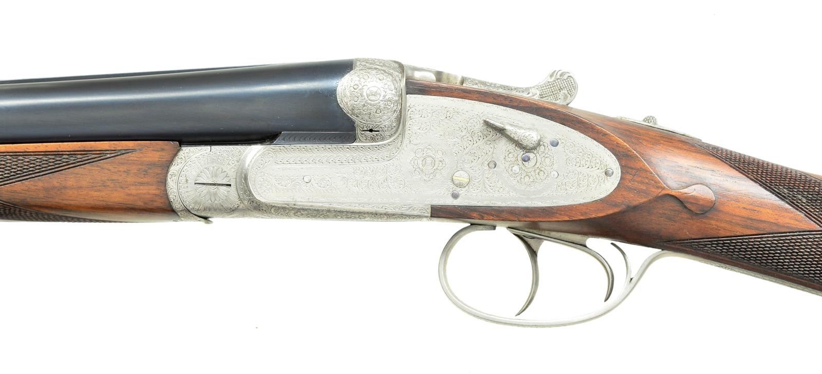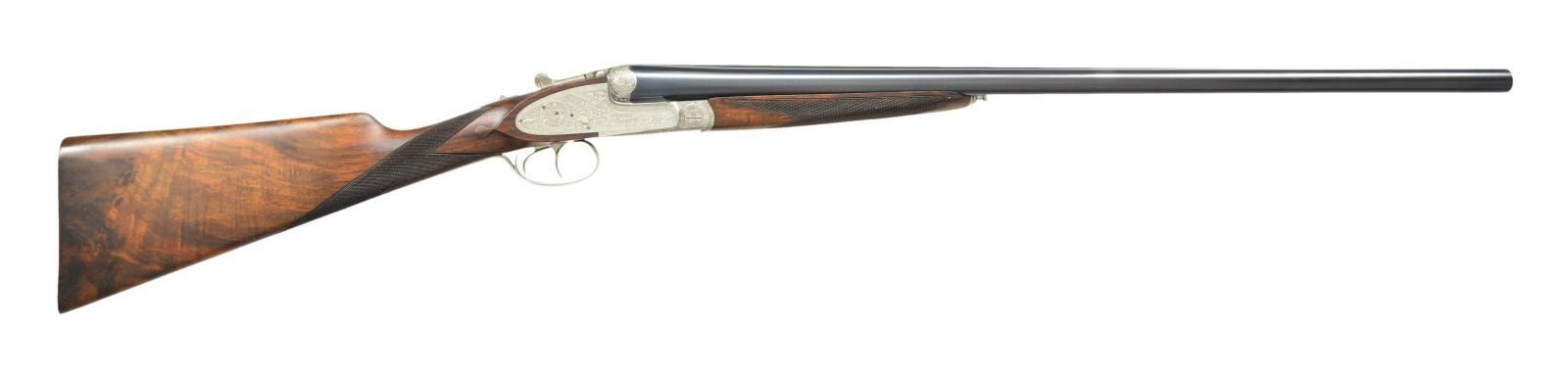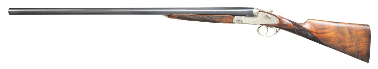 Cal. 12 ga. 2 3/4". S# 19795. (1976). The 27 5/8" bbls. fitted with concave game rib are engraved "ARMAS "EL CORZO" EIBAR" on top of right bbl. Bbl. flats are stamped with 1976 Spanish proofs for 2 3/4" chambers. H&H type self opening assist spring mechanism is attached. Coin finished sidelock action features automatic safety, hidden third fastener, sideclips, bushed strikers, H&H type hand detachable locks, gold band tumbler end cocking indicators and double triggers (front articulated). Action is hand engraved with near full coverage English type traditional rose and scroll. Maker's name is at the bottom of each lockplate and also on bottom of action. Single beaded trigger guard is also scroll engraved. Straight grip buttstock of well figured European walnut measures 14 3/4" over skipline checkered wood butt and features drop points and point pattern checkering at grip. Matching wide splinter ejector forend has Anson release. MEASUREMENTS: BBLS: Bore Diameter: R .728", L .729". Restriction: R .021" (MOD), L .044" (EXTRA FULL). Min. Wall Thickness: R .027", L .022". STOCK: DAH: 2 1/4". DAC: 1 1/2". LOP: 14 3/4". CAST: neutral. WEIGHT: 6 lb. 11 oz. CONDITION: very fine, close to new with a scattering of marks in wood, metal retaining essentially all of its finish with one or two minor marks. Bores are bright and shiny. Mechanically crisp. (22-4467/MGM). MODERN. $2,500-4,000.